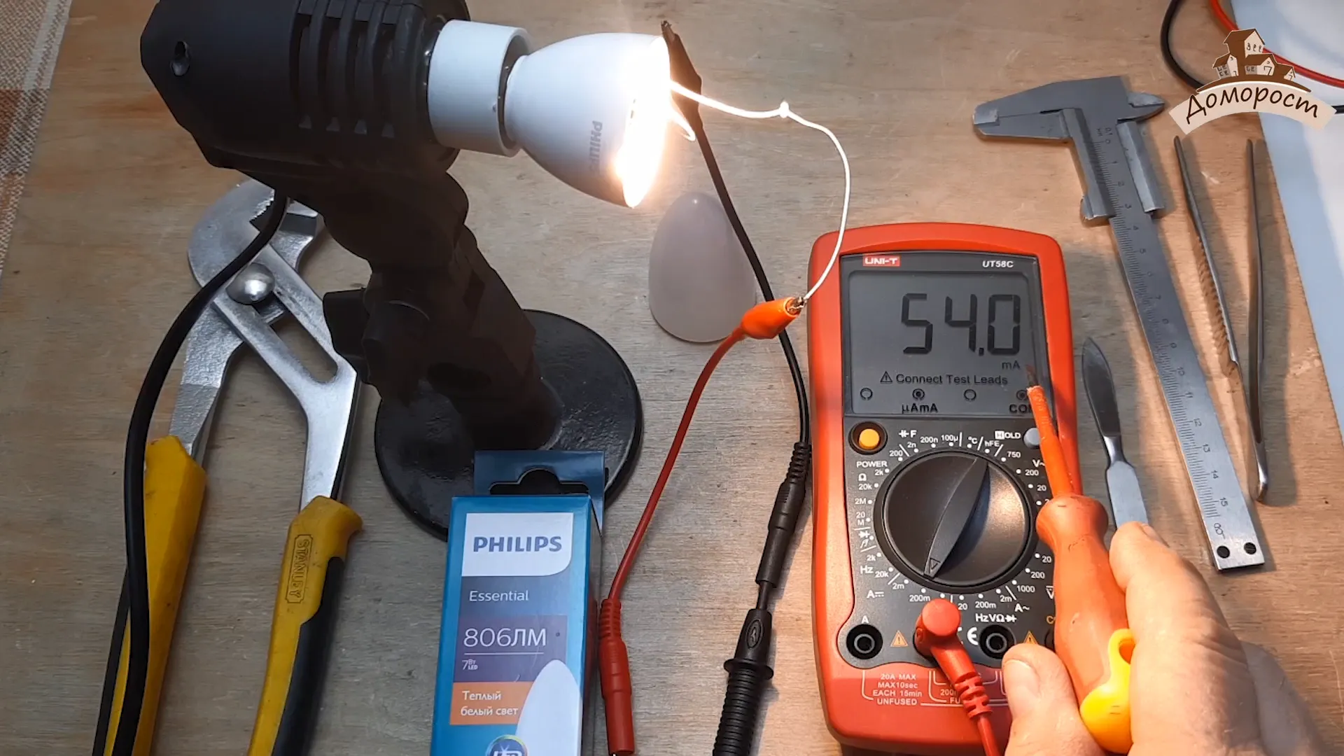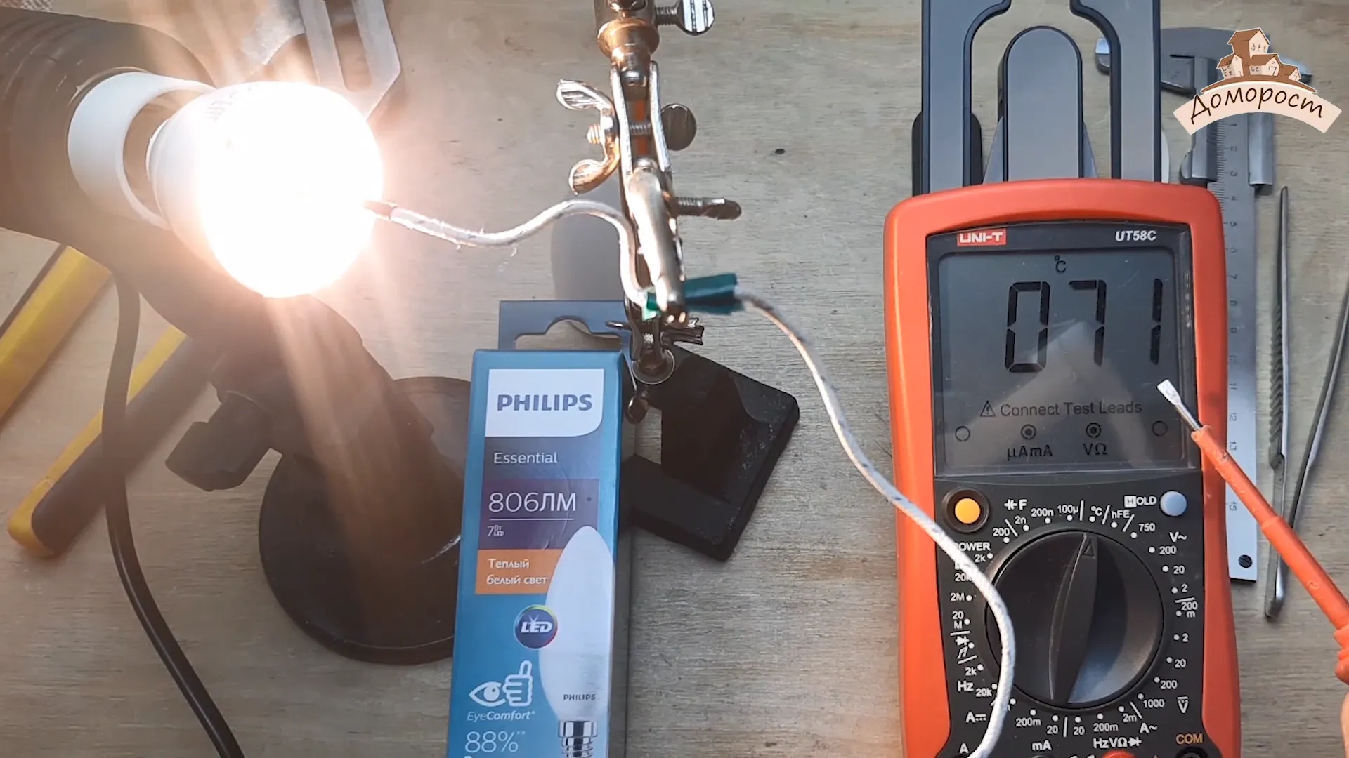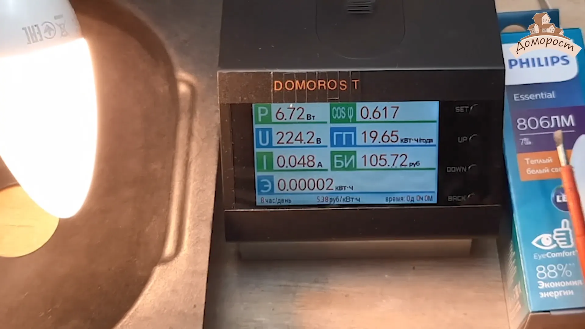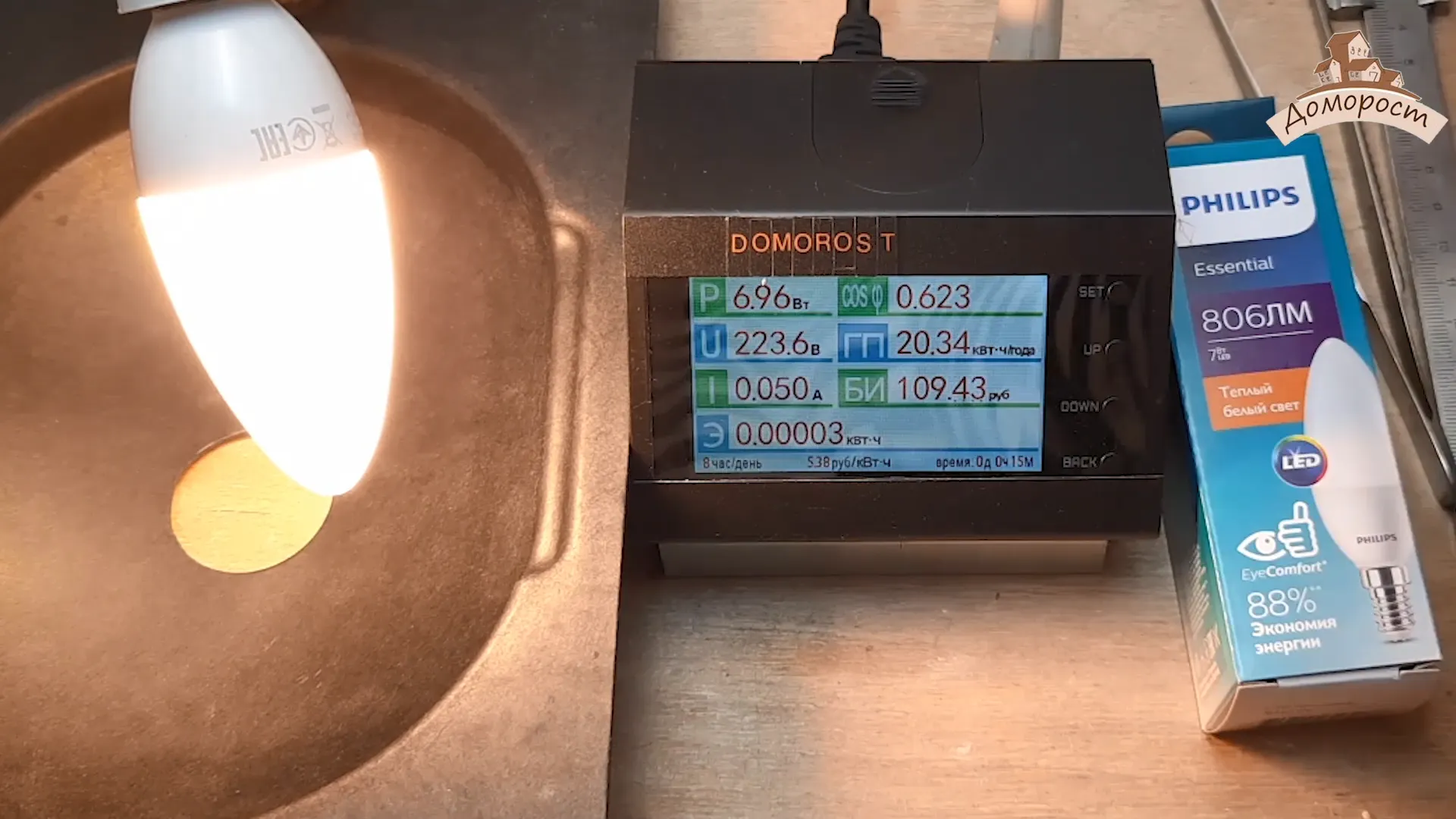 При 230 Вольт на входе показания прибора меняются незначительно. Всего 6.96 Вт, считаю что это все те же 7 Вт. Филипс — лампа продуманная.