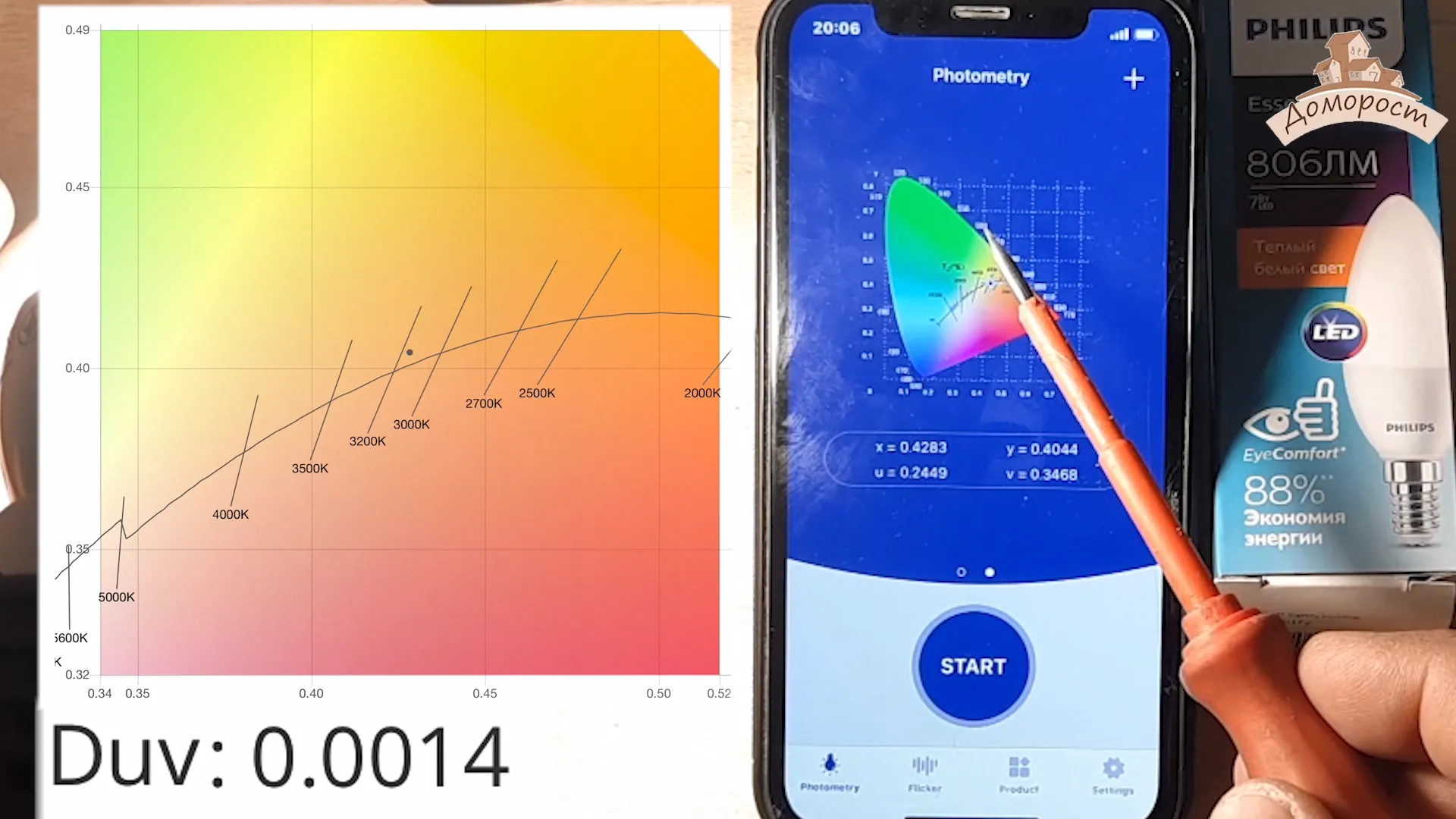 Теперь измерим реальные характеристики качества света: индекс цветопередачи (CRI) - 81, а цветовая температура — 3159 К.
