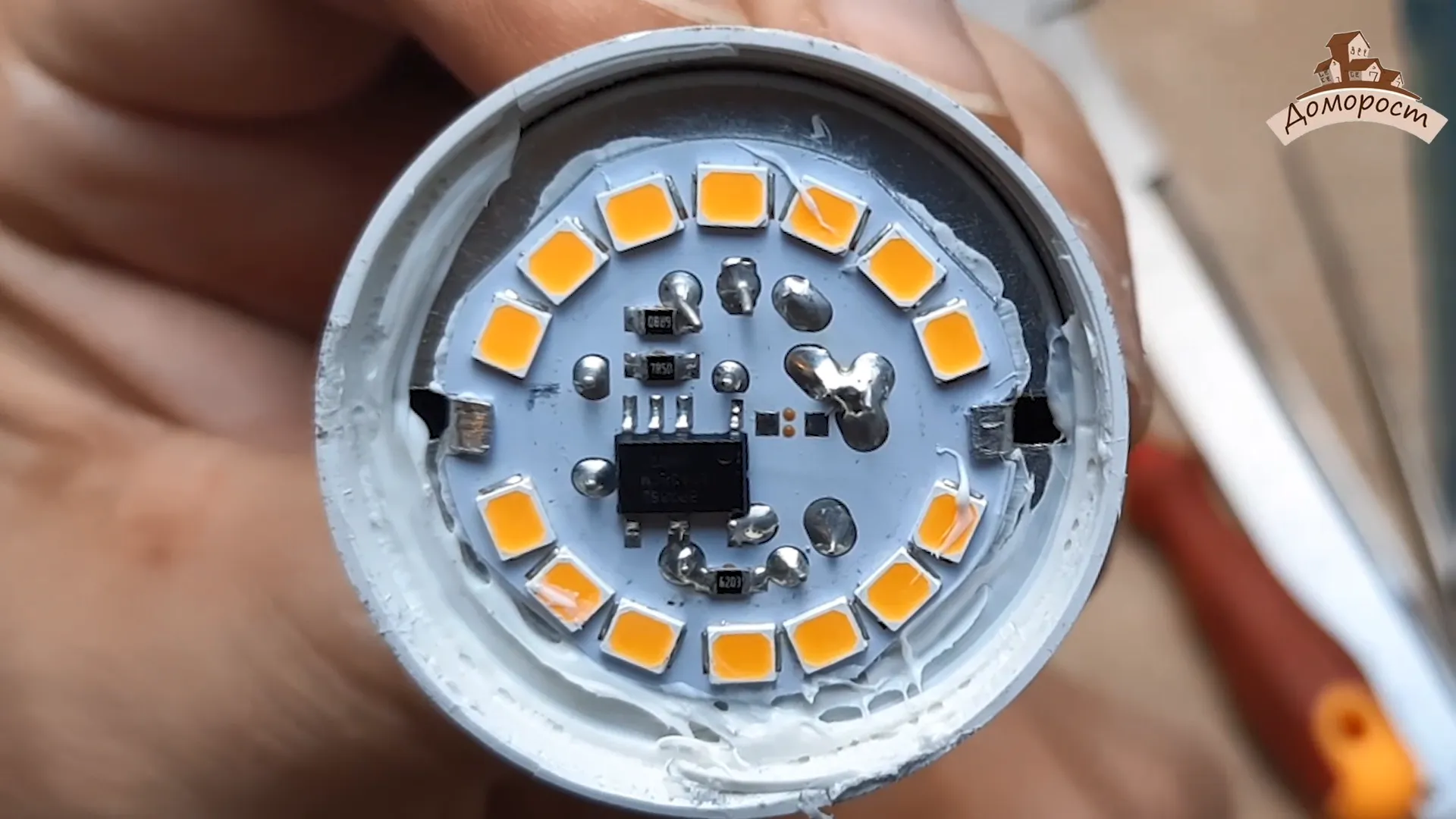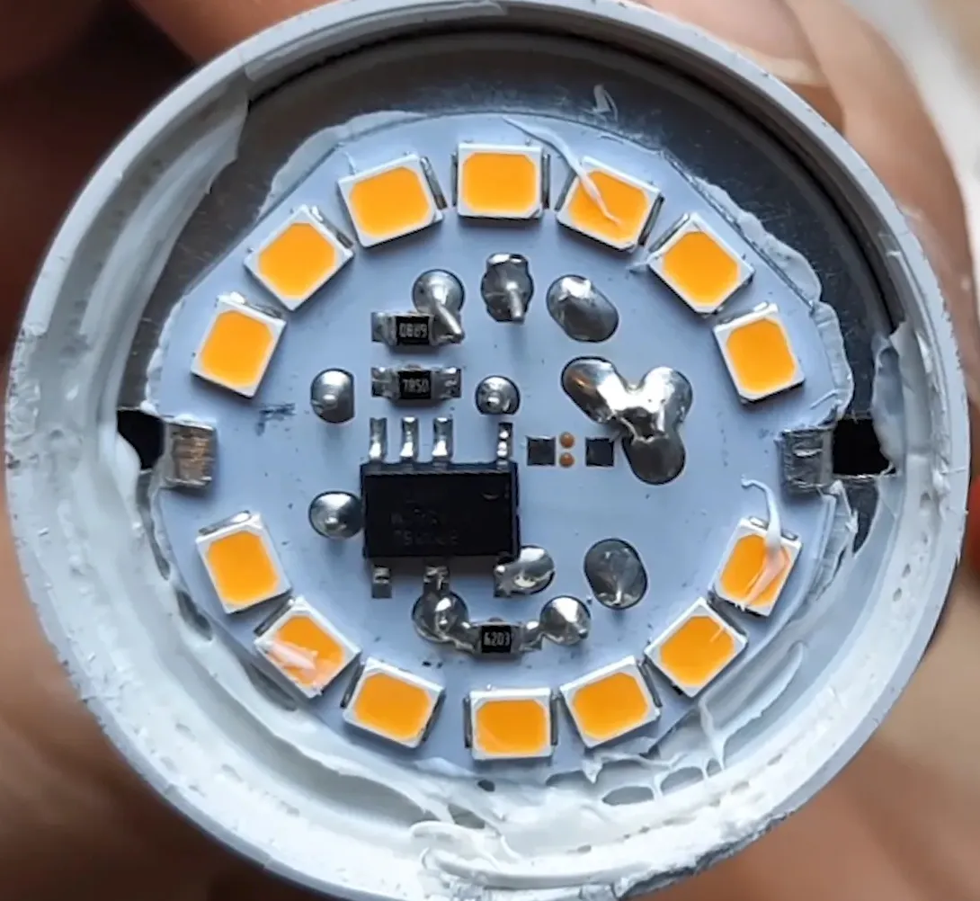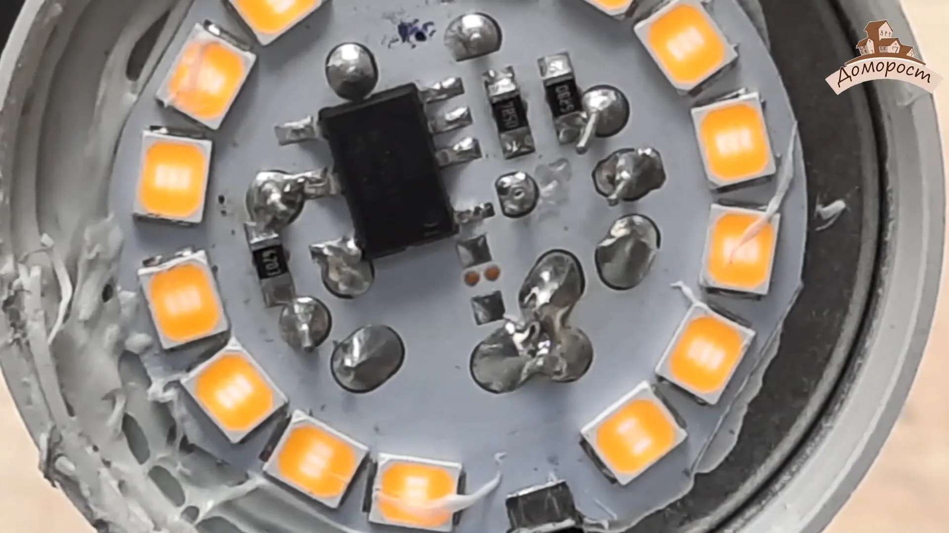 Под рассеивателем находятся 14 корпусов светодиодов, под люминофором угадывается по три маленьких кристалла. Вместе с корпусами светодиодов на диодной плате греется микросхема стабилизации тока.