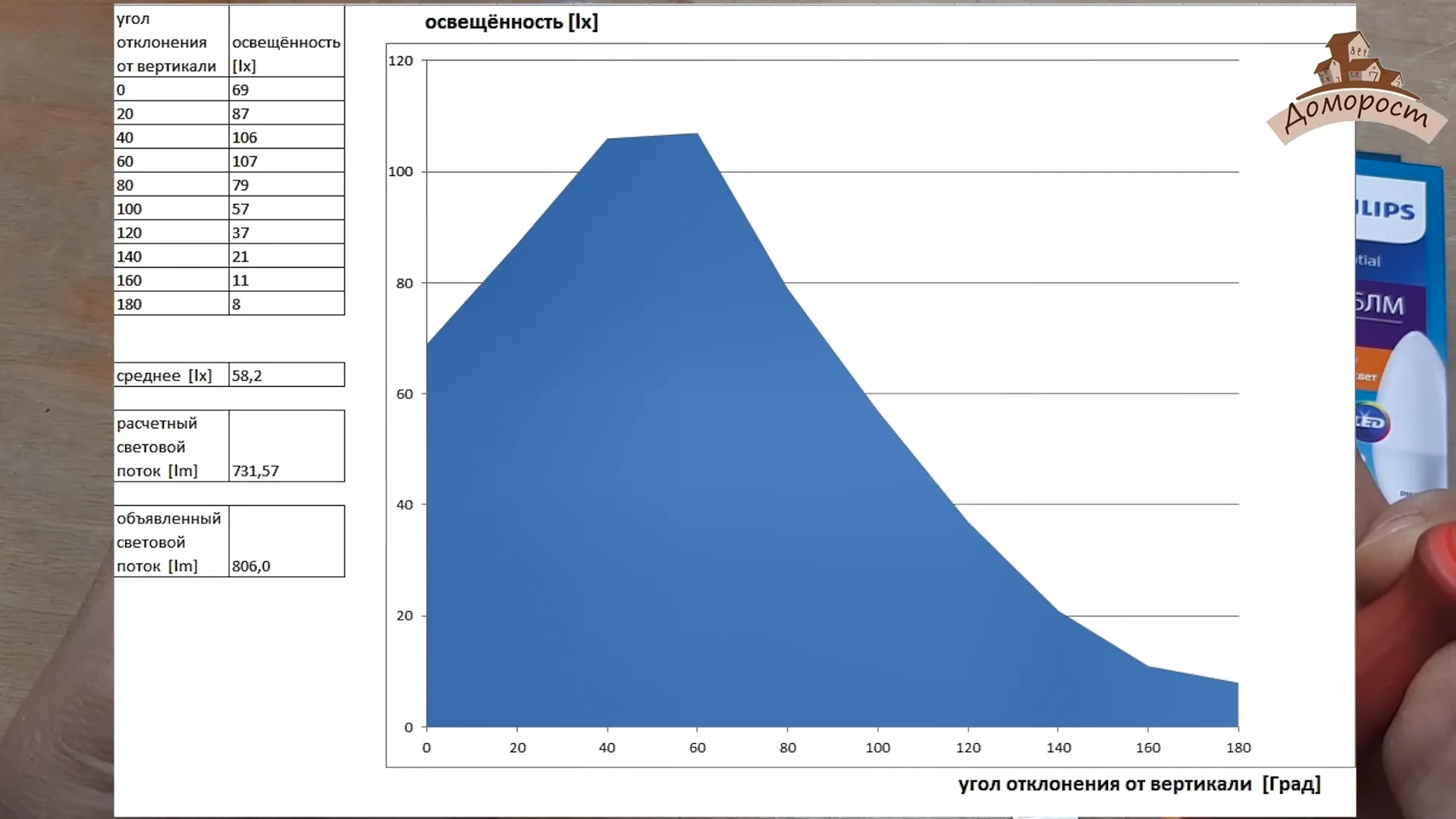 Снимем диаграмму освещенности светодиодной лампочки philips на 7 Вт, световой поток у меня вышел равным 731 Люмен, в то время как производитель указывает 806.