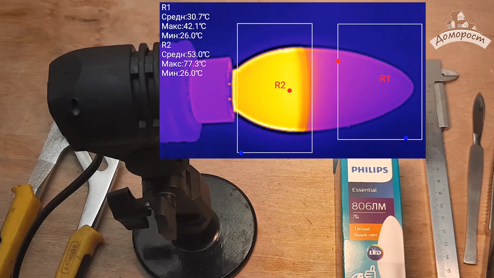 Максимальная температура колбы лампы — 42.1 градуса по Цельсию, корпус — 77.3 градуса.