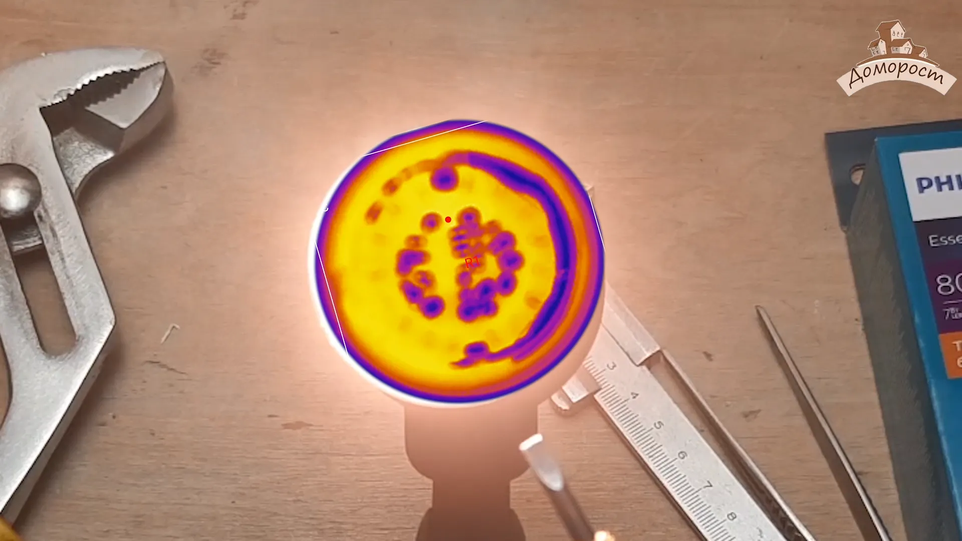 Измерим температуру диодной платы со снятым рассеивателем. Выбрать точку максимального нагрева на диодной плате мне поможет тепловизор.