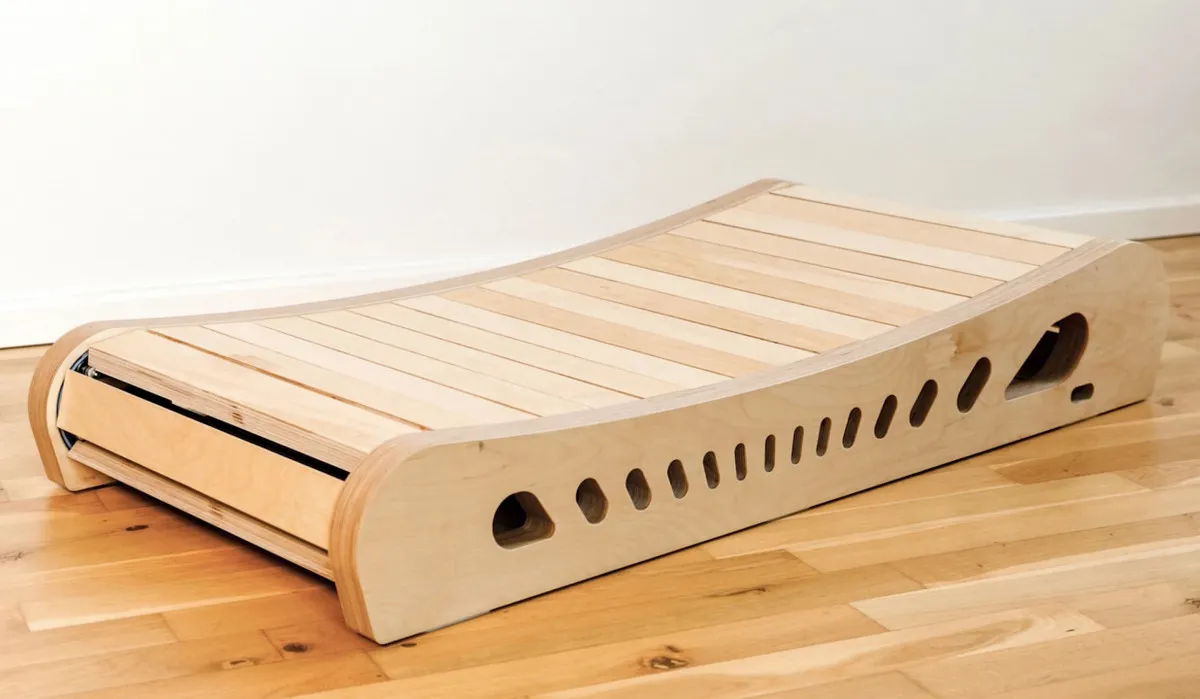 Главная фишка Office Walker — он подстраивается под владельца. Если нужно сосредоточиться или выполнить точное действие мышкой, достаточно просто остановиться, и устройство тут же «замрет». Первый рабочий образец был сделан из цельного дерева, но на практике во время испытаний оказалось, что поверхность слишком жесткая. В финальной версии заменили планки на более упругие — ходить стало мягче, а конструкция прослужит дольше. Поскольку система модульная, элементы можно снять, промыть или заменить, в комплекте лежат запасные детали и подробная инструкция.