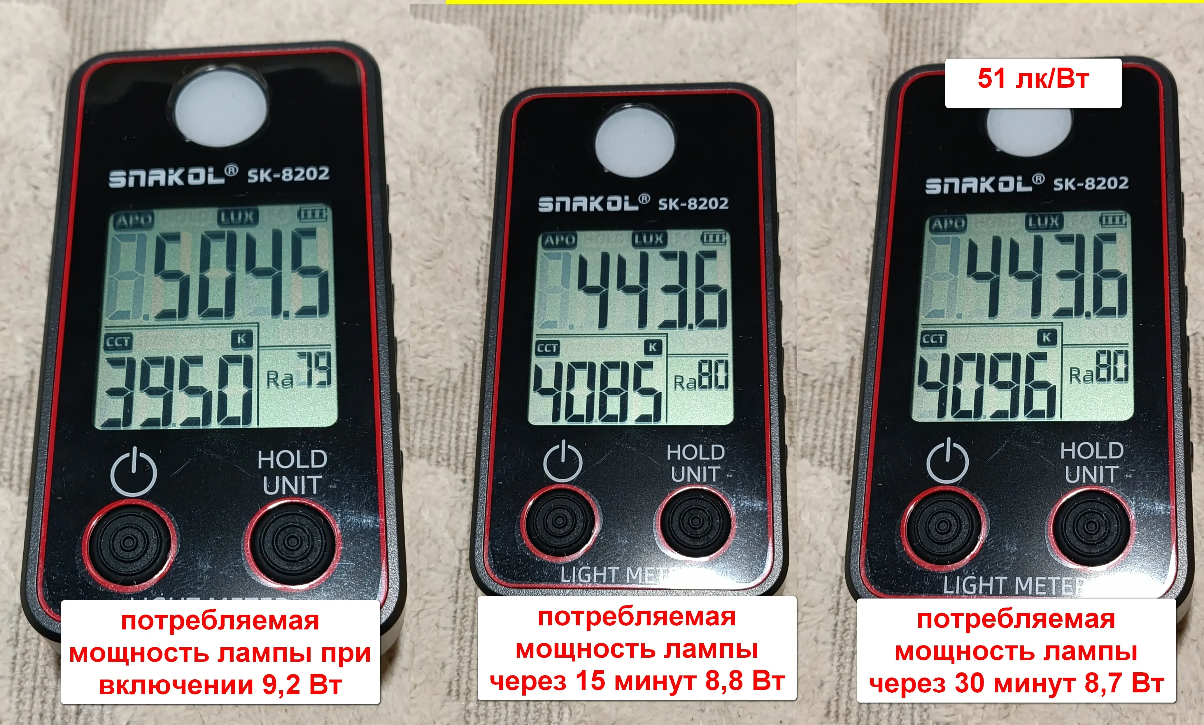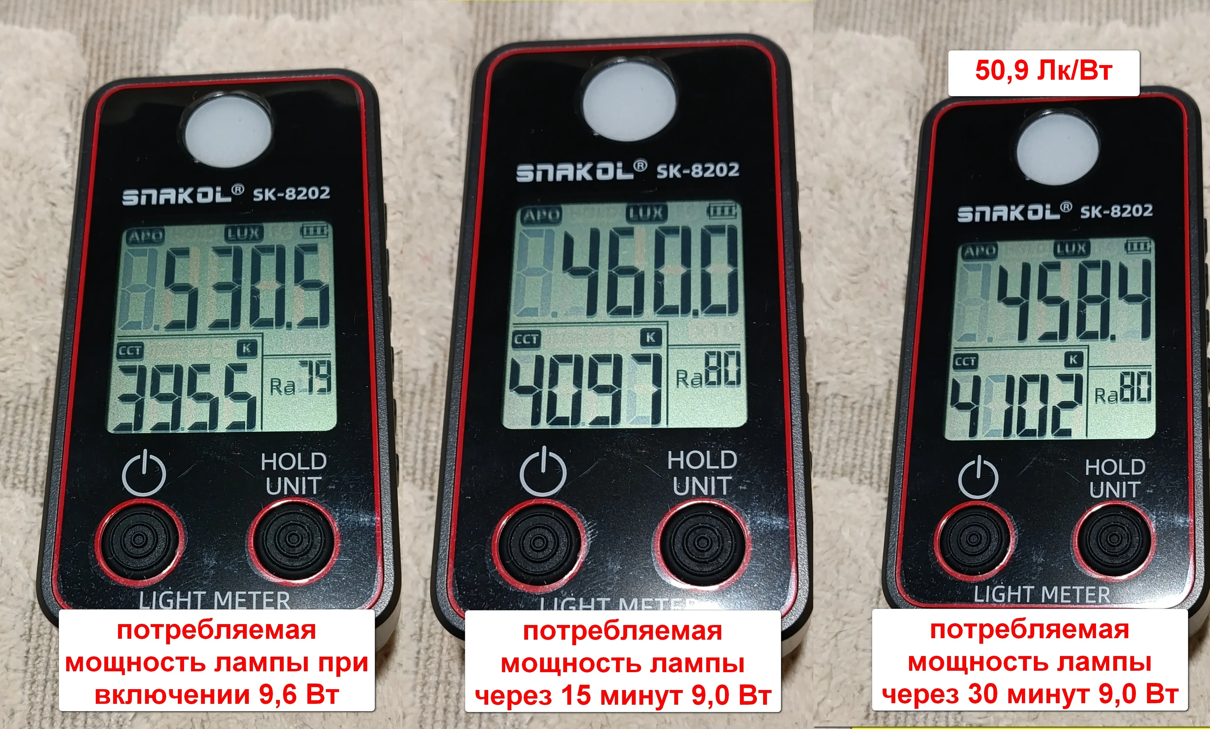Далее посмотрим как изменится эффективность лк/Вт . Исследуем на примере лампы LedsPower . Уменьшаю мощность до 9 Вт . Освещенность от лампы LedsPower составила 458,4 лк против 447,3 лк у Osram . В таком режиме работы мы также видим уменьшение потребляемой мощности в сравнении LedsPower 9W (458,4 лк) против Osram 10 W (447,3 лк) , при схожих значениях освещенности . Для ясности целесообразности такой доработки необходимо также измерить температуру диодной платы под рассеивателем у обоих ламп . В любом случае уменьшение значений тока через светодиоды в лампе LedsPower увеличит их ресурс.