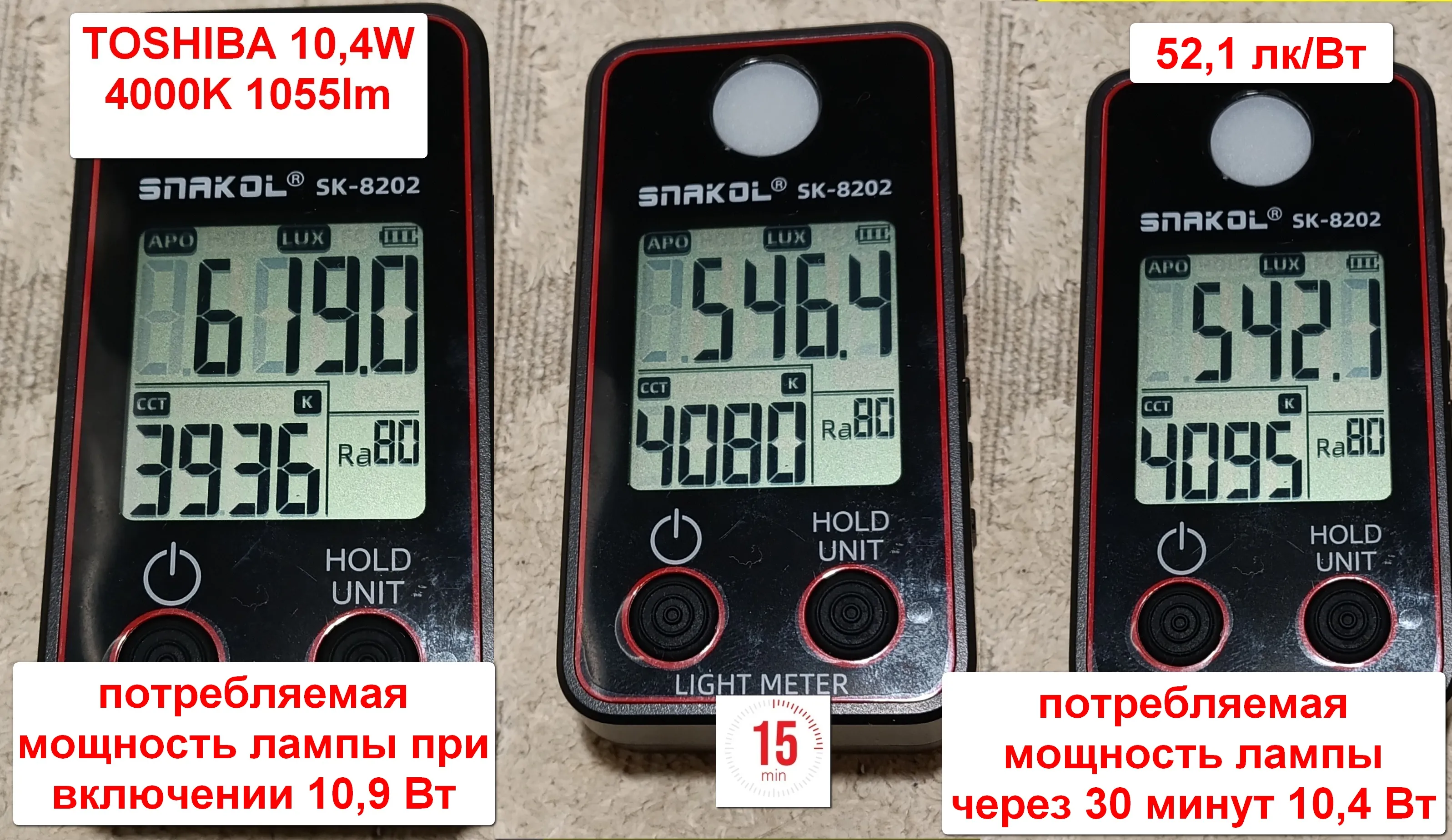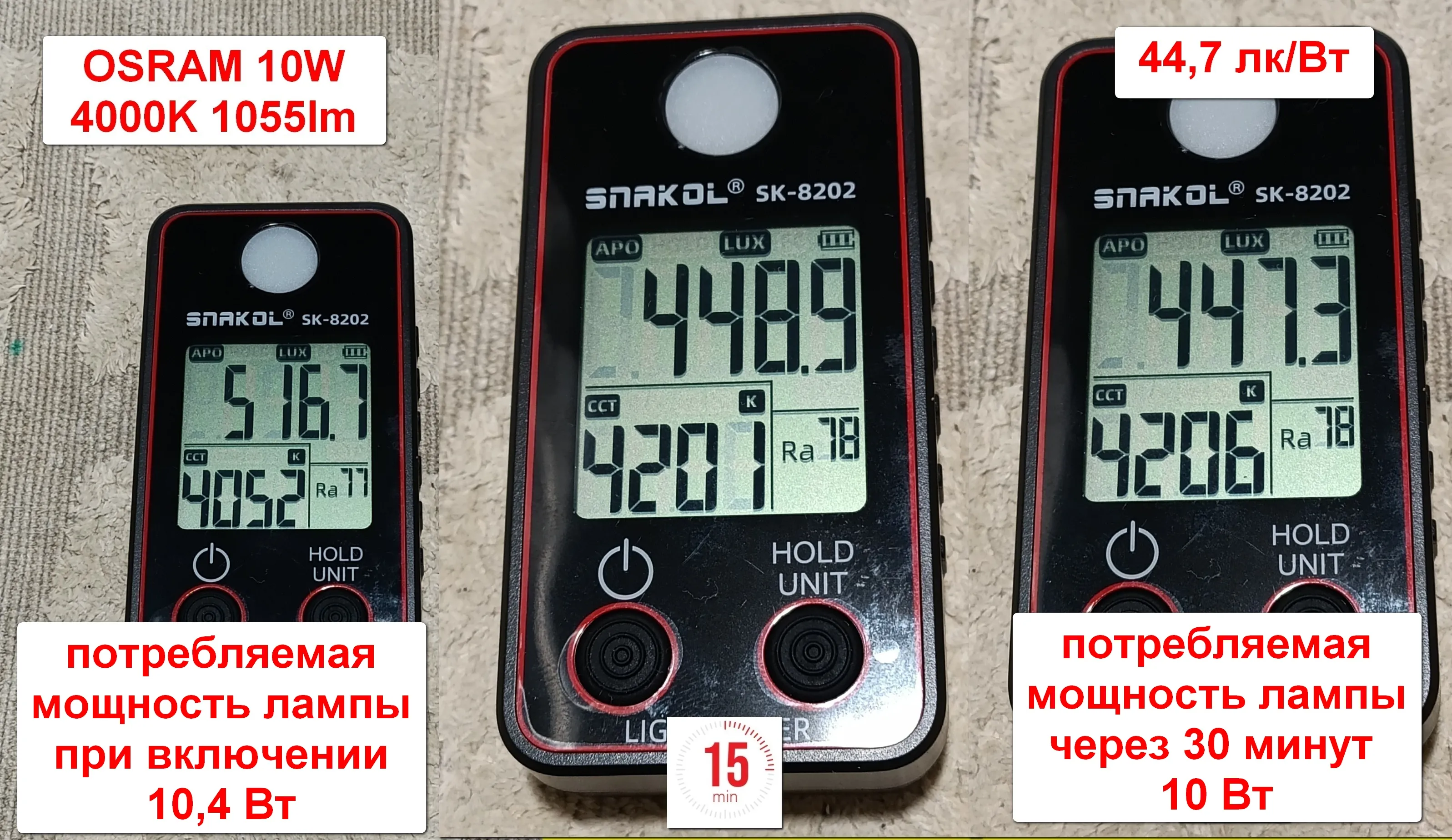Потребляемая мощность лампы Osram никакие не 12 Вт . Мощность при включении 10,4Вт , а после прогрева лампы 10 Вт . Индекс цветопередачи Ra 78 . Цветовая температура 4206 К. Освещенность 447,3 лк.