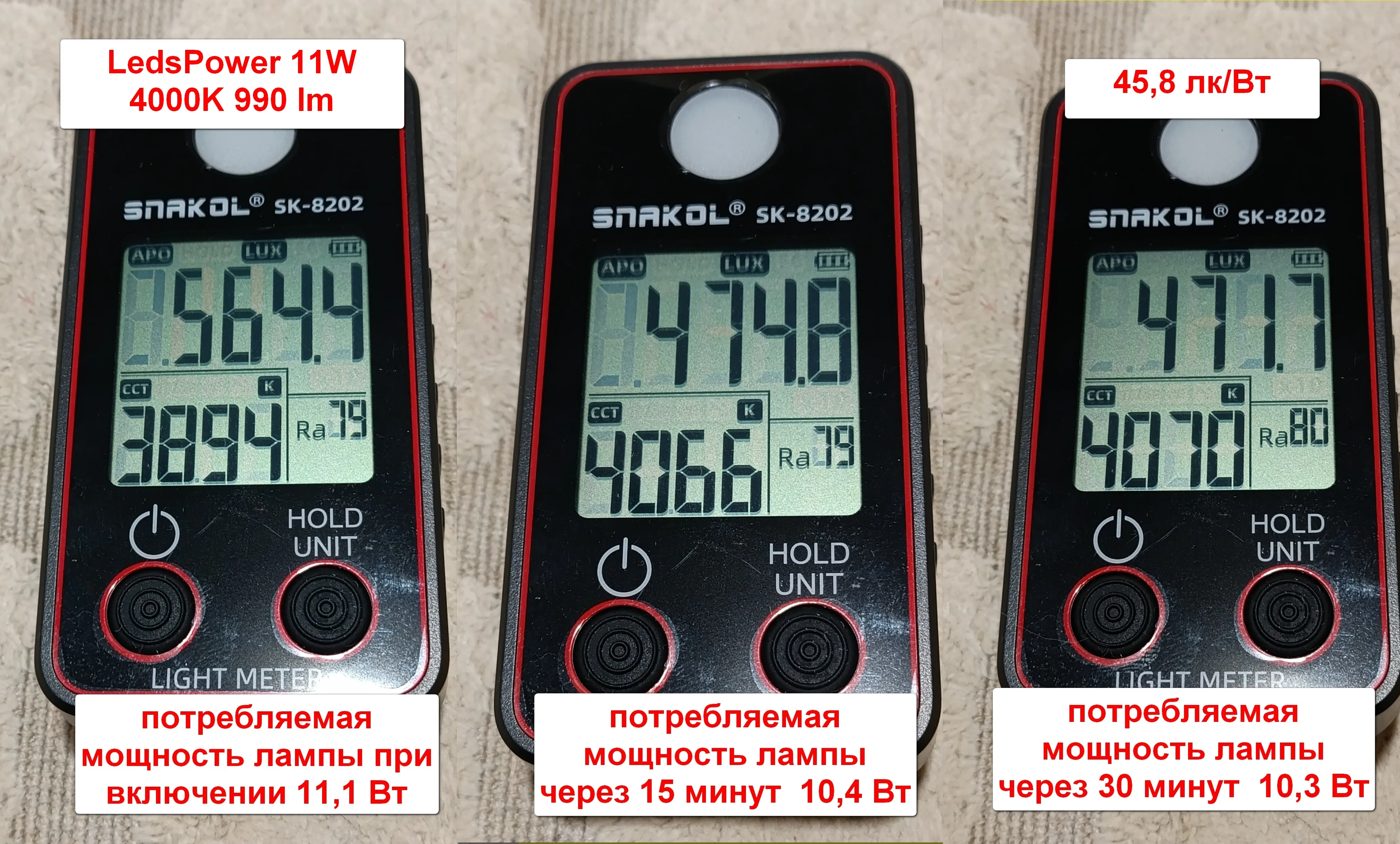 Теперь лампа LedsPower 11Вт. После прогрева лампы мы видим потребляемую мощность 10,3 Вт . Цветовая температура 4070 К , при заявленных производителем 4000 К. Индекс цветопередачи лампы Ra 80. Освещенность 471,7 лк.