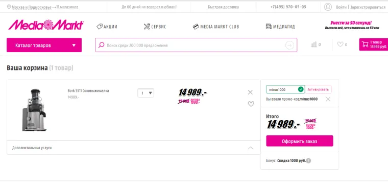 По рекомендациям @Dimon приобрела эту соковыжималку в медиамаркете. Нагружаю как могу, пока очень довольна. Не знаю что уж там про то, что она чего-то не выдерживает, но я за раз 5кг яблок сразу сделала. Приятно порадовало, что яблочки влезают в нее целиком. Жмых чуть-чуть влажный, можно сказать сухой. Из этого жмыха ничего не сделаешь, кстати, на выброс весь ушел. Что еще, сам сок чистенький, прозрачный. Довольно много пены, но от этим страдают все центробежные соковыжималки - это воздух, который вспенил сок. Пока всем полностью довольна, но не прошло и недели с покупки, позже напишу более подробные комментарии. Так, вот еще, мне дали промокод, который будет работать какое-то время в этом магазине, снижает цену на 1000р, он очень оригинально назван "minus1000" не знаю сколько он проработает, но проверить легко - добавляете заказ в корзину и перед покупкой жмете на кнопку "ввести промокод", куда его и вводите (без кавычек, разумеется), должно стать так: