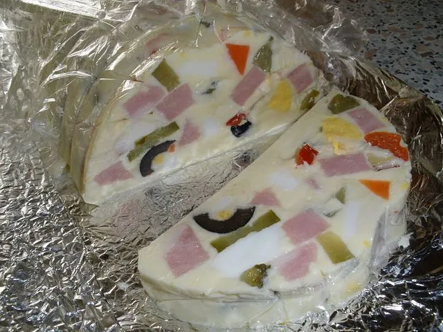 После застывания прикрыть пленкой или фольгой, чтобы поверхность не засыхала и не портился вид. А только потом нарезать, как на фото, и положить на кусочек батона, например. Дальнейшие украшения излишни. Кстати, сочетание майонеза и желатина вполне подходящее.