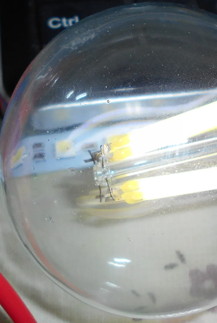 Впервые вижу, чтобы у лампочки в стекле были пузырьки... В лампах накаливая такого не видел. Здесь же, как я понимаю, высокие температуры отсутствуют, а также отсутствует "большое" давление, вот видимо поэтому снижены требования к качества стекла, раз есть пузырьки. Думаю, если герметичность и оптические свойства не нарушены - то можно считать это допустимым. Но конечно же - это "не дело".