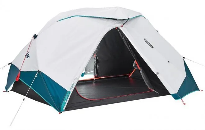 Такая разработка принадлежит компании Decathlon из Франции, известной в сфере товаров для спорта и туризма. Свою первую подобную быстро собирающуюся палатку они продали еще в 2005 году. Сегодня это двухслойная (полиэстер, обработанный полиуретаном) версия для двух человек, которая не разбирается и при этом очень устойчивая, так как может выдерживать порывы ветра до 50 км/ч и сильный ливень. Дно палатки также защищено от попадания влаги (примерно 5000 мм водяного столба). Монтаж палатки осуществляется путем извлечения специальных тросов-натяжителей, у которых есть автоматические фиксаторы. По всему периметру в установке участвуют колышки и веревочные натяжители. Изнутри палатка обшита материалом с черным покрытием, который блокирует проникновение света. Для защиты от насекомых есть противомоскитная сетка. Интересна конструкция палатки и тем, что имеет два отдельных входа с предбанниками, 4-е окна для вентиляции, внутренние карманы, полочки для вещей и крепление для фонаря на потолке.