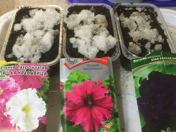 Начинаю фоторепортаж. Посадила петунью. Опять со снегом.