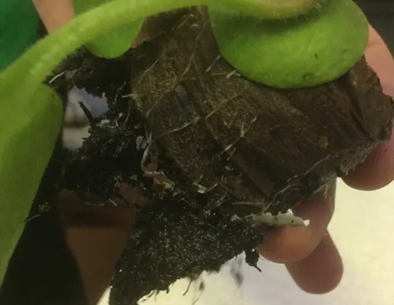 А вот так выглядит корневая система нашего цветка, видно, что корни проросли сквозь торф. Срочно требуется пересадка!!!