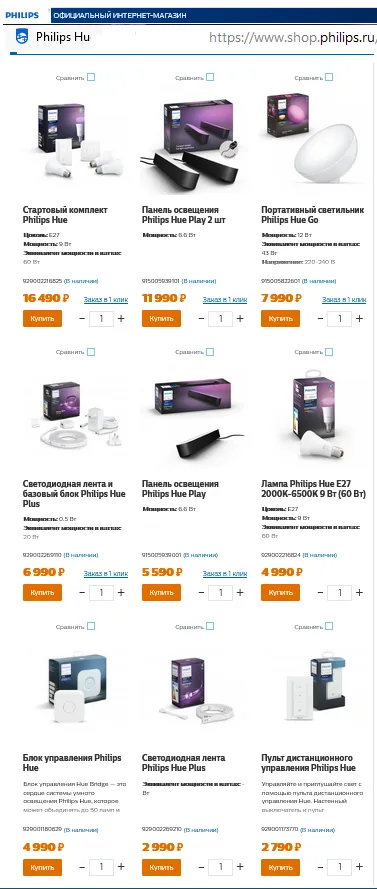 Какие именно устройства Philips Hue сегодня доступны перечислять не буду, всё хорошо понятно из прикрепленного скриншота интернет магазина.