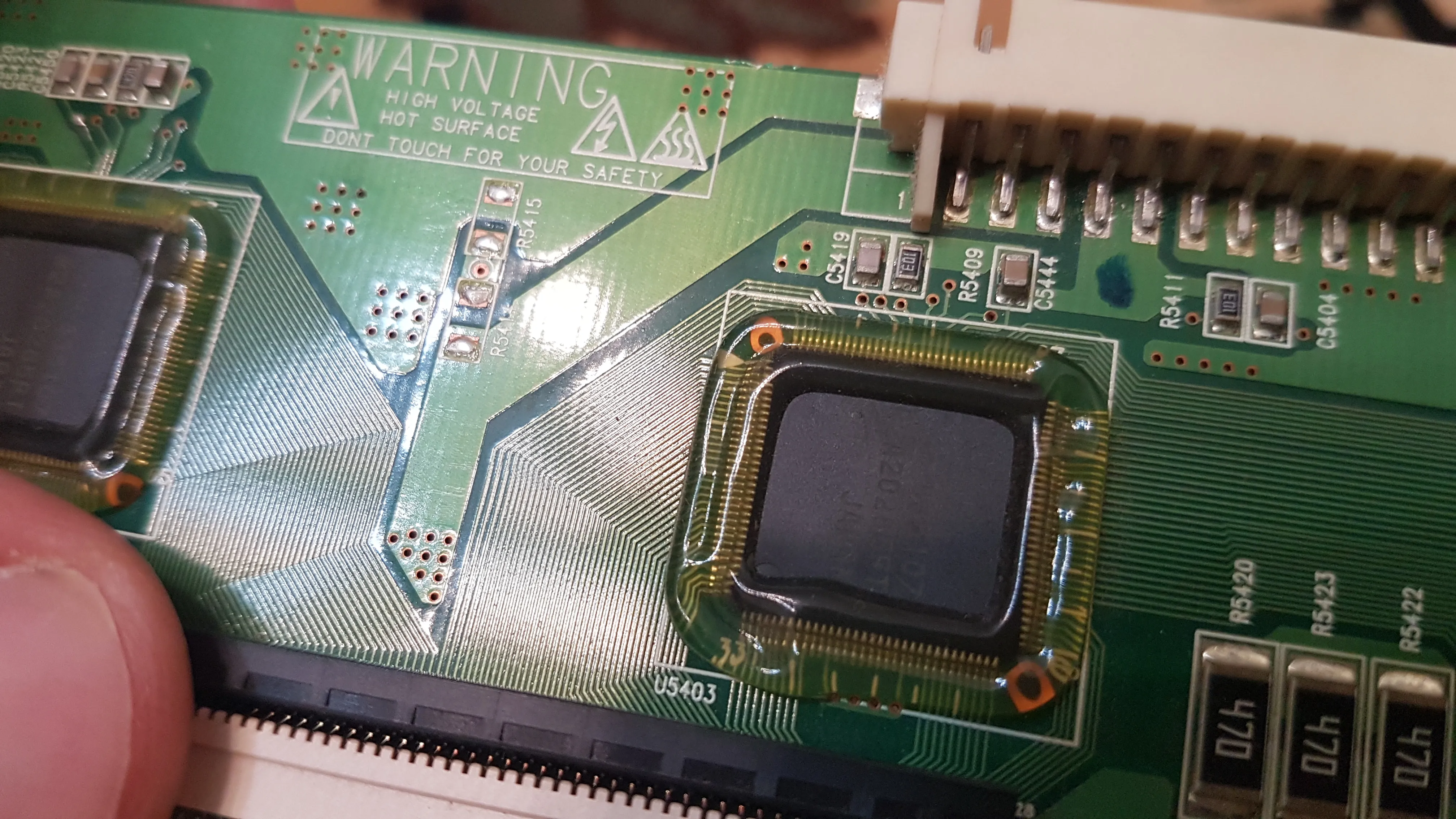 Похоже, все переживания были напрасны, ну или почти... Сгорела всего лишь одна микросхема скандрайверов. За диваном у меня как раз стоит точно такая же плазма с разбитой панелью, весь комплект деталей для моего любимчика.