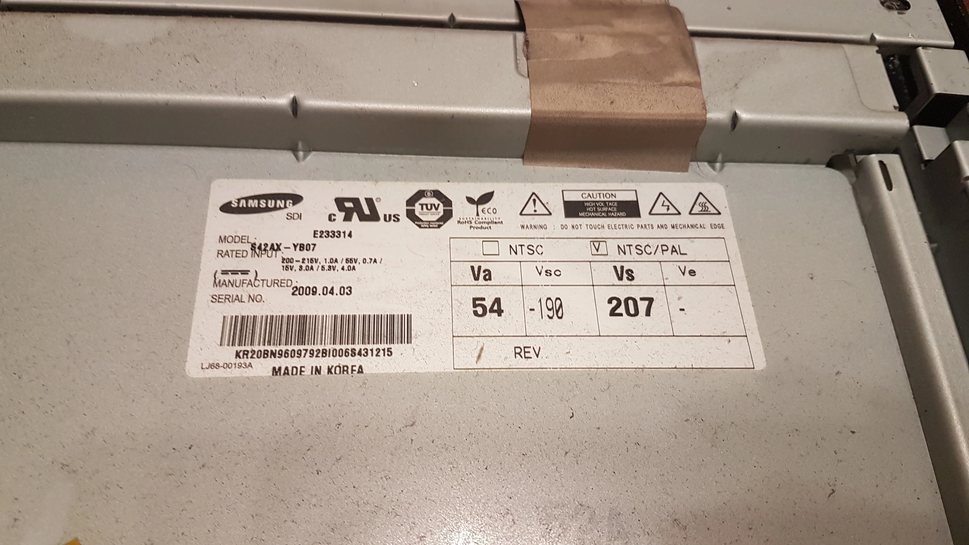 Экскурсия окончена, берем нужную плату и ставим в мой телек. Все поставлено, собрано, перед этим еще провел профилактику Y-main, пропаял кольцевые трещины и заменил парочку конденсаторов, которые встречал в неисправном виде уже на таких же платах в других телеках, и конечно, хорошо затянул все болтики. Подведем предварительный итог: вышла из строя только одна плата, больше повреждений я тут не вижу. Все собрано и сделано как надо, должно работать. Маркировка сгоревшей платы, если кому то это интересно: