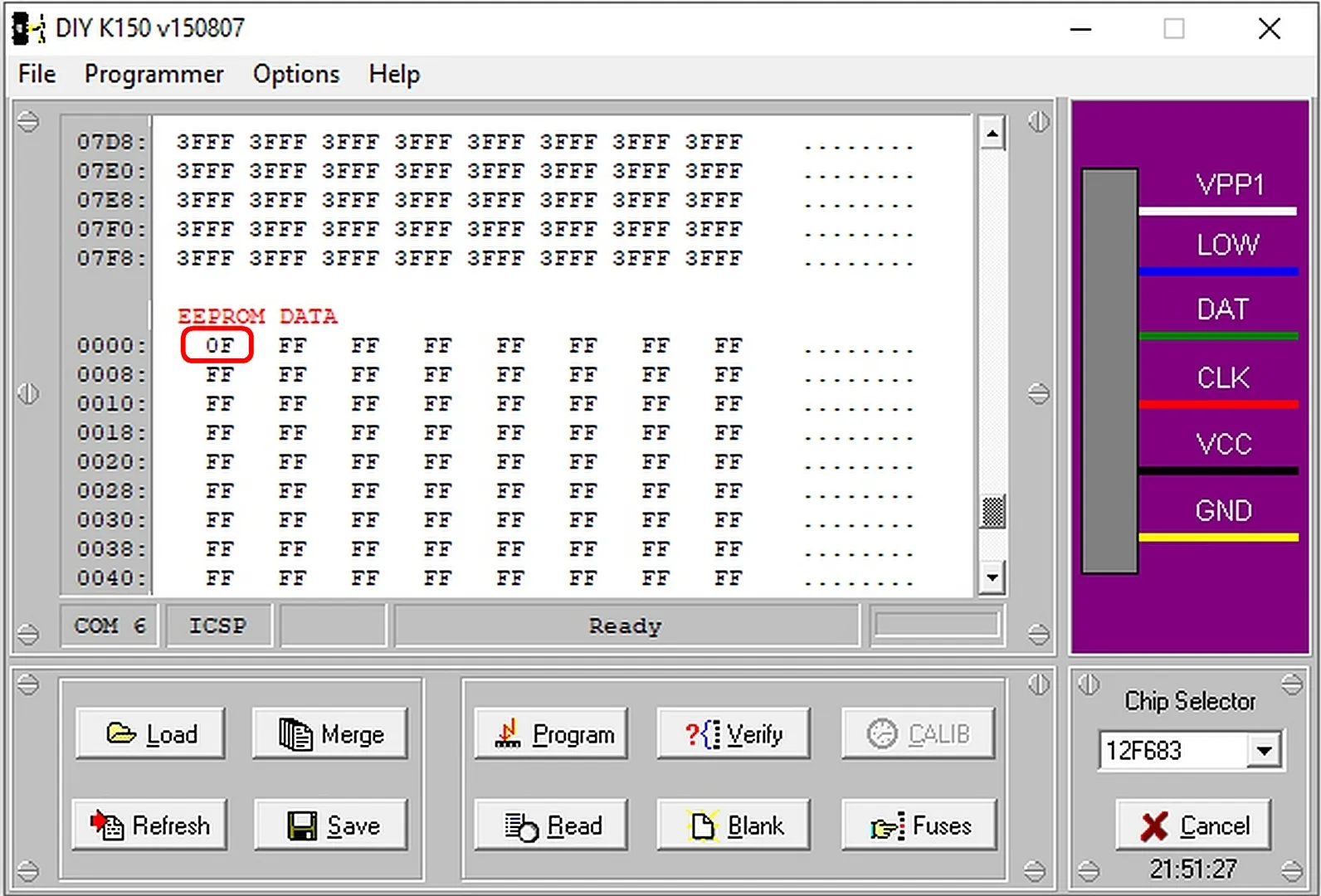 Посмотрим данные EEPROM микроконтроллера .В ячейке с адресом 0000 значение 0F , т.е. в системе этот пожарный извещатель будет номер 15 . Других данных (калибровки датчиков извещателя) в EEPROM мы не видим.