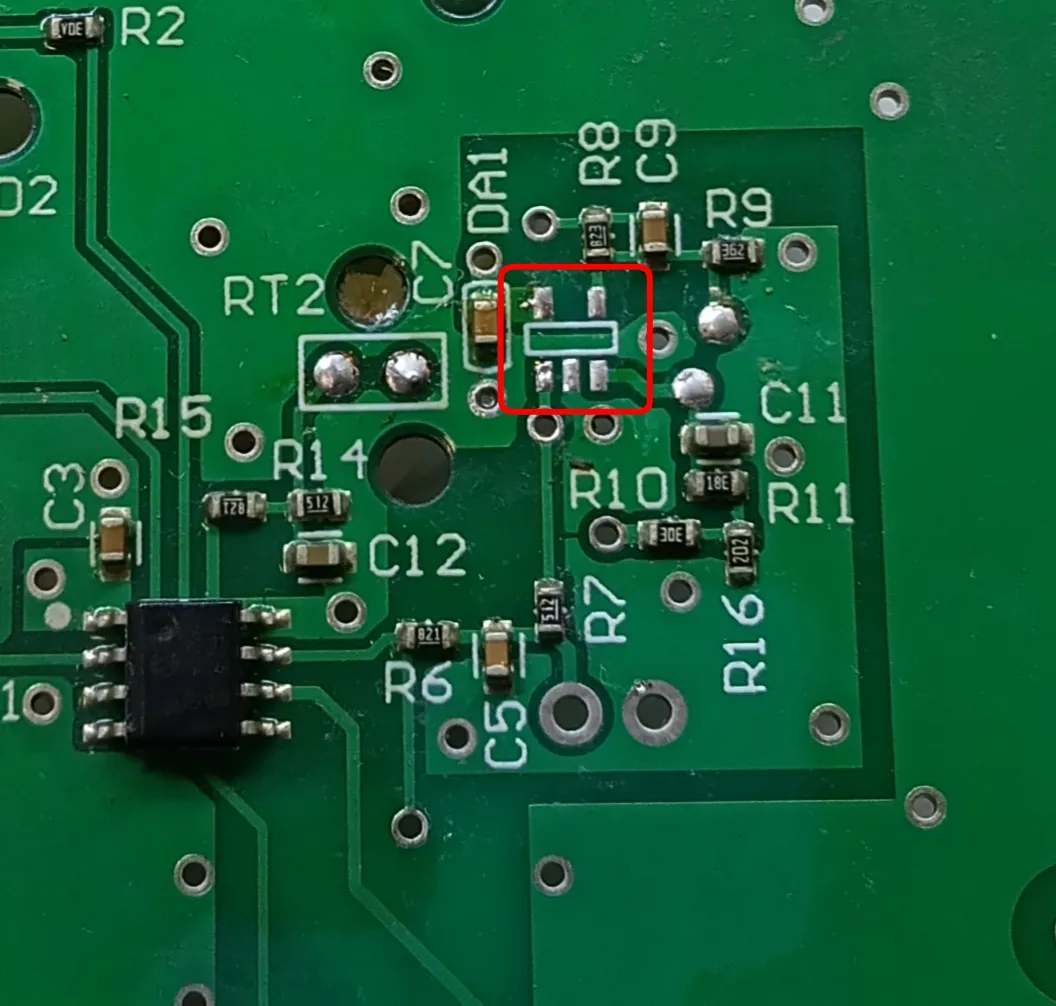 С обратной стороны печатной платы мы видим , что кем-то демонтирован прецизионный операционный усилитель .