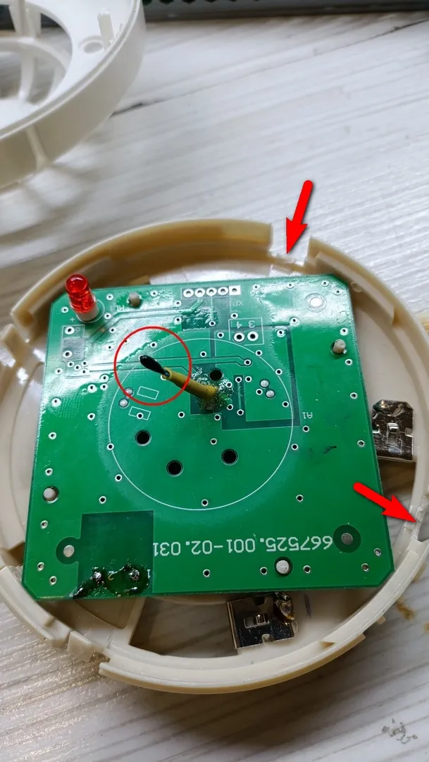 По традиции вскрываем . В извещателе отсутствует дымовая камера . Термодатчик на месте и это означает , что извещатель тепловой . Ранее кем-то вскрывался , т.к. сломаны две защелки по стрелке .