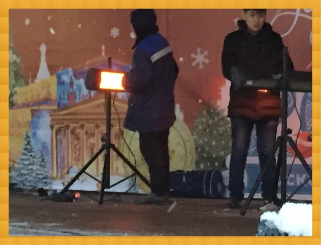 В конце площадки установлена сцена. Пока она для обогрева рабочих