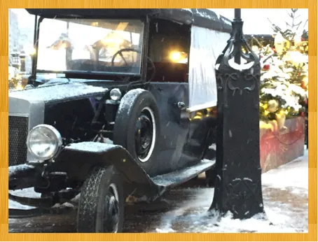 Рядом с входом стоит ретро автомобиль