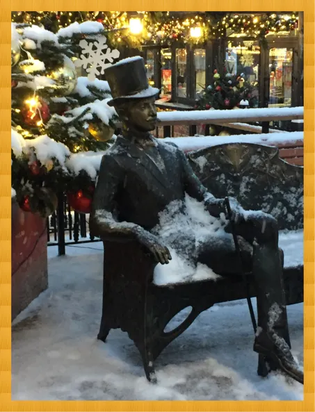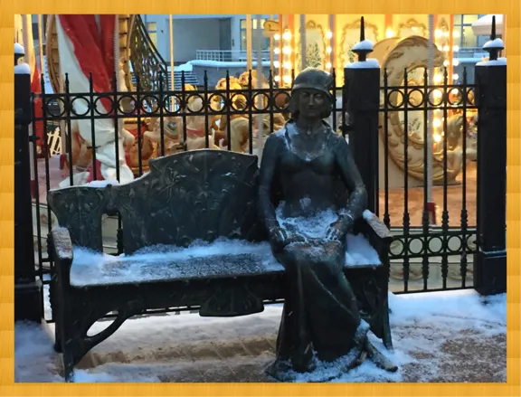С живым персонажем рядом парочка из 19 века, каждый на своей скамеечке.