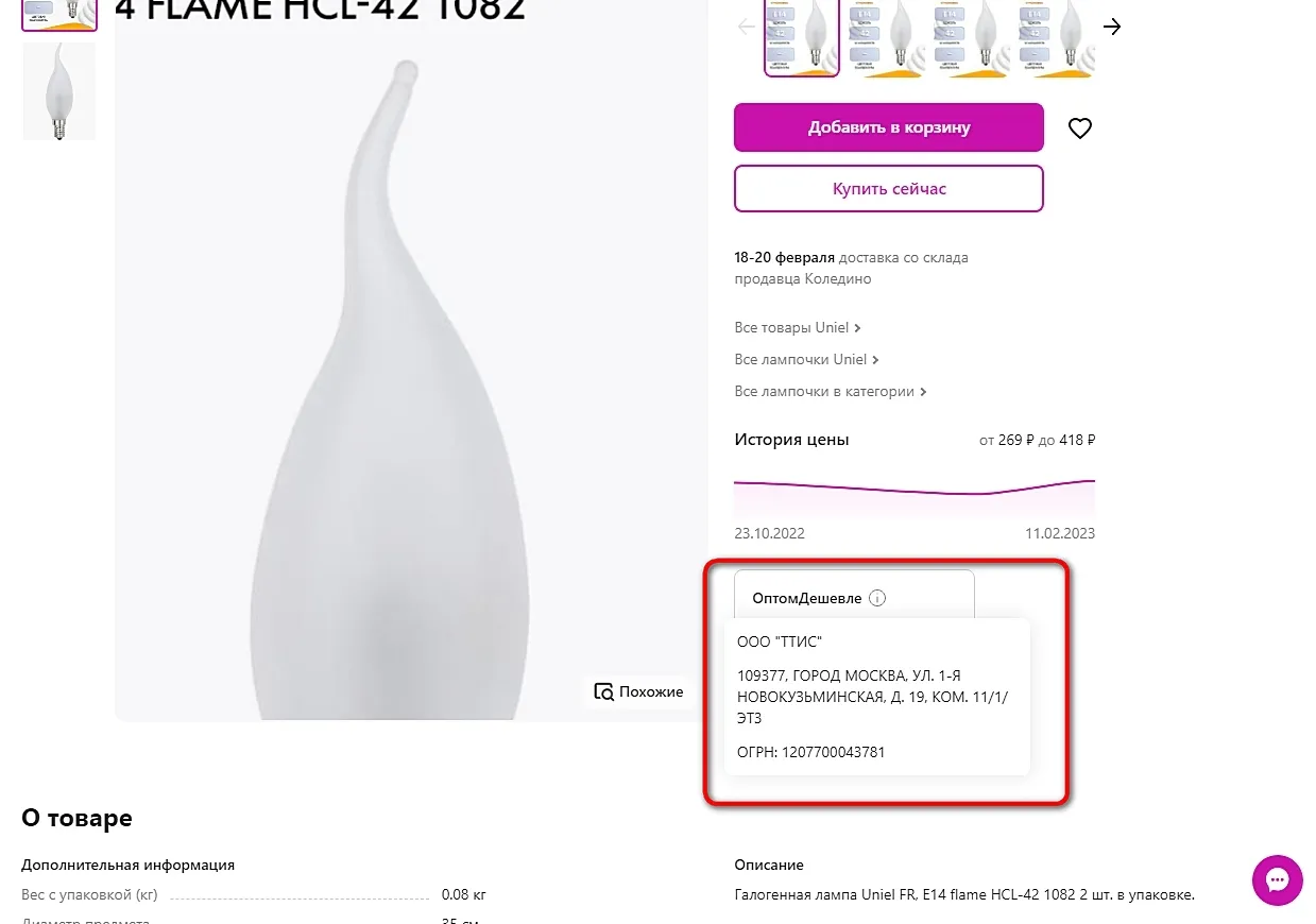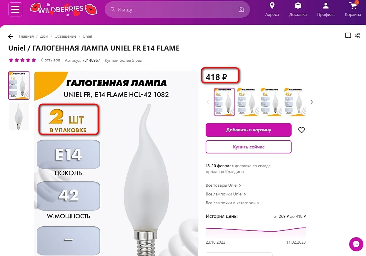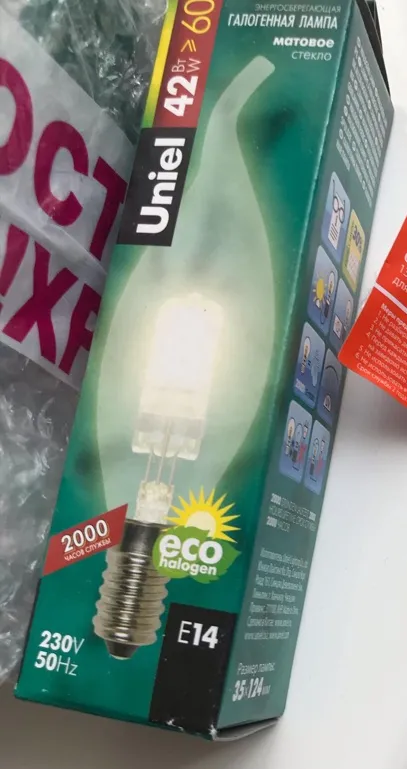 Предлагаю сравнить цены . Две галогенки Uniel FR, E14 flame HCL-42 1082 на Wildberries стоят 418 рублей.