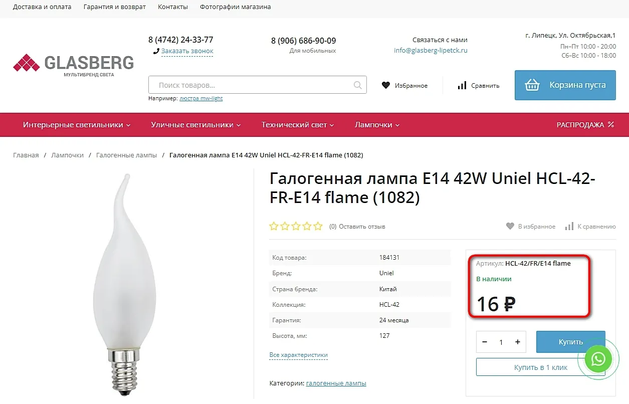 Такая же лампа в другом магазине НЕ на Wildberries стоит 16 рублей . Продавец "GLASBERG"