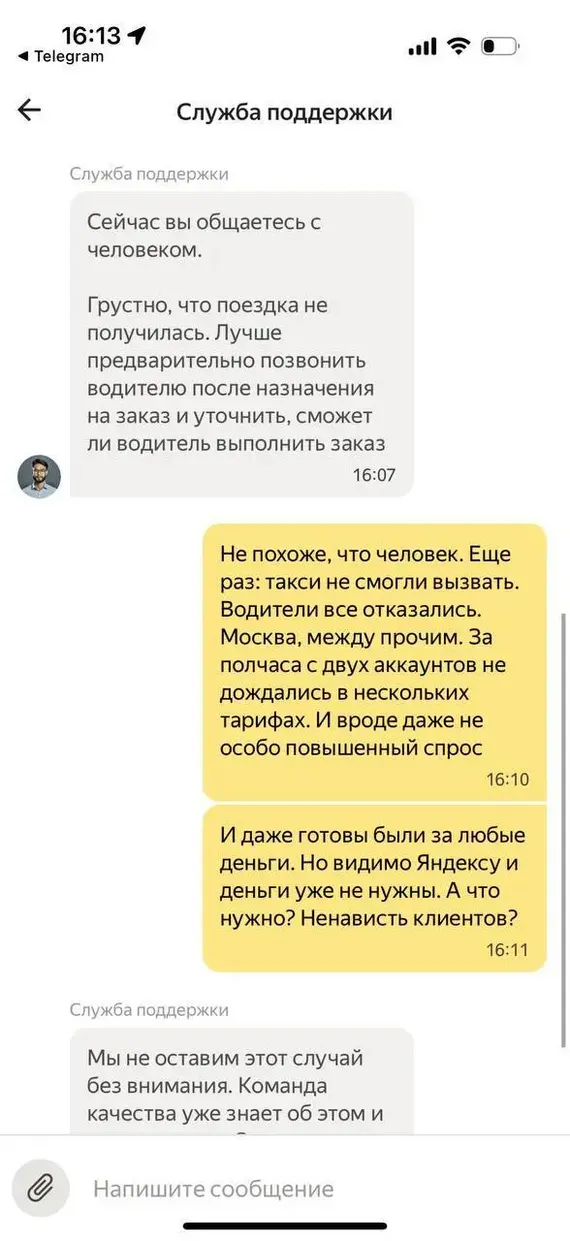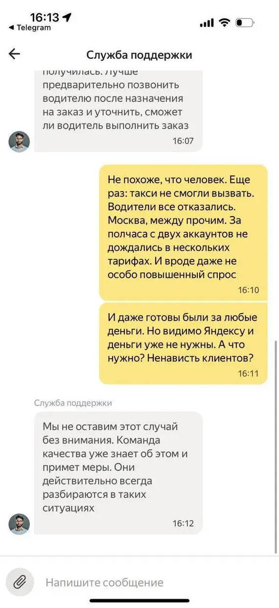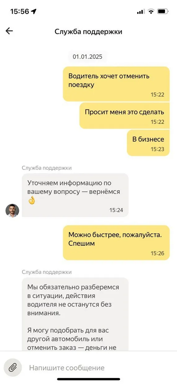 И знаете прям вопросик - яндекс делает большие глаза и просит писать в поддержку. Но при этом автоматически определять просьбу со стороны водителя отменить - никак. Круто, а я стою с сумками и тыкаю на смартфон - моего времени не жалко.