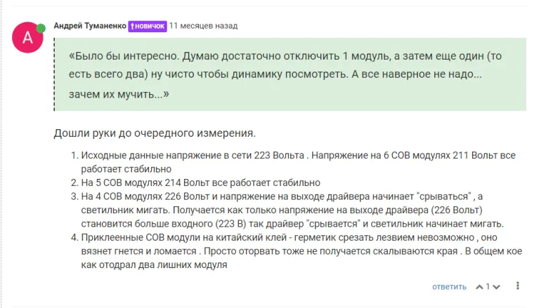 @Схемотехник Если в обычной светодиодной лампе выйдет из строя один светодиод , то погаснет вся лампа . В моем случае выход из строя одного COB ика изменит напряжение на выходе драйвера в большую сторону . При этом заявленное напряжение изготовителем 220-240 Вольт, а значит главное не превышать 240 Вольт. Полагаю 240 Вольт на выходе драйвера будет , если сгорит три и более COB иков. За год эксплуатации погас всего один и то он был "прожарен" напряжением 290 Вольт , т.е. не исключены повреждения кристаллов . После такой "прожарки" он отработал год и работает сейчас. В общем , чтоб убить светильник временем понадобиться несколько лет . Есть такие же COB ики на 7 и 9 Ватт. Значит в них все более "усиленное" должно быть? Думаю если на них собрать светильник и занизить напряжение до 180 -190 Вольт на выходе драйвера , то получится неубиваемый вариант
