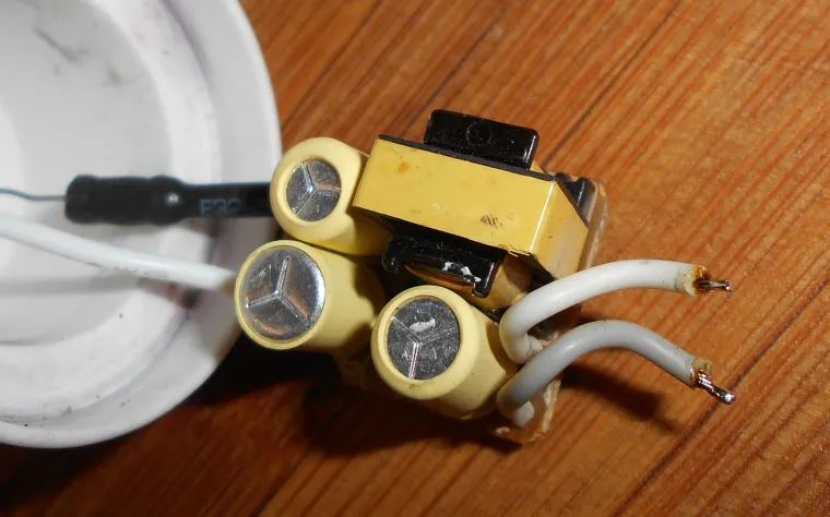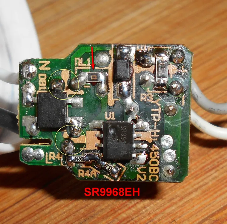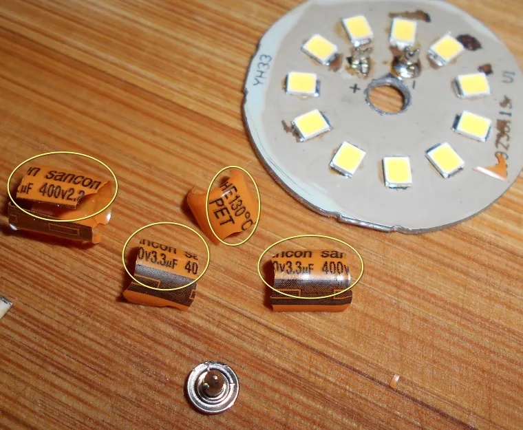 В лампах с линейным драйвером светодиоды обычно на 18 Вольт , закорачивая один сразу минус 18 Вольт . А их количество обычно набирают для 220 Вольт . Sancon не измерял , т.к. драйвер работает адекватно . От высоких температур рассохлась и обсыпалась изоляция на конденсаторах . Но по остаткам понятно , что они на 400 Вольт . 3,3мк*2 после диодного моста и 2,2 мкф на выходе драйвера. Лампа не из дешевых , но вместо дросселя L1 похоже просто SMD перемычка в фильтре . Или это дроссель?