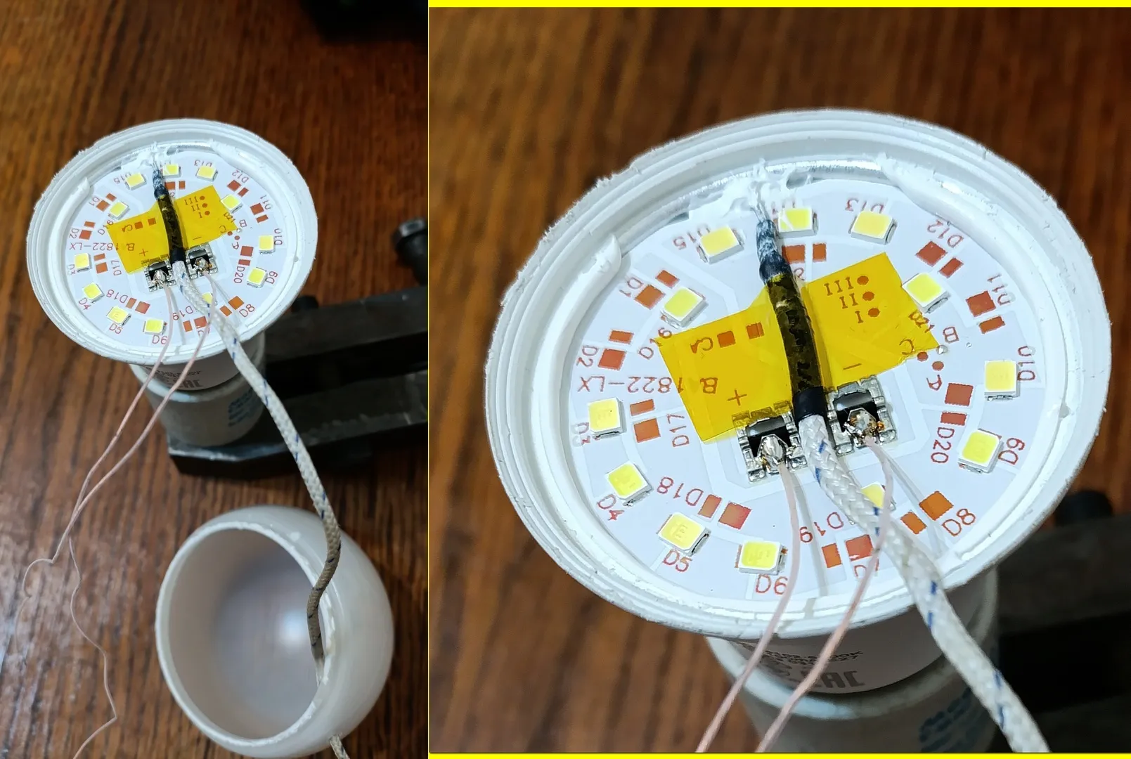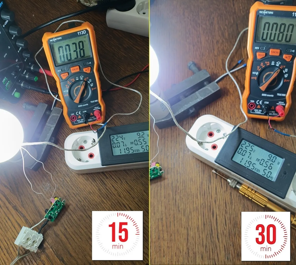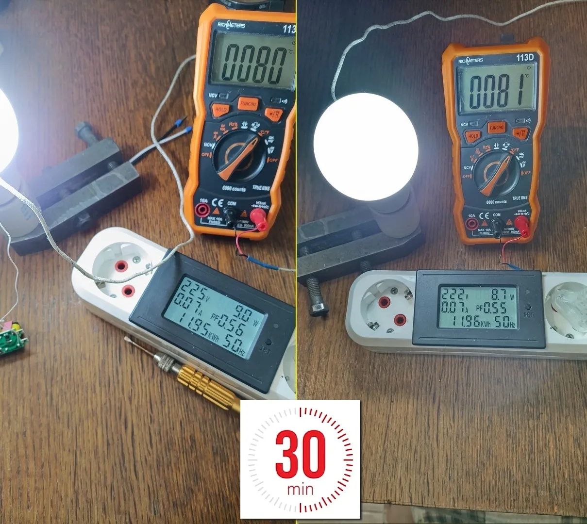 После установки драйвера в лампу температура радиатора увеличилась на 1 °C , а потребляемая мощность лампы после прогрева уменьшилась на 0,3 Вт . Получается после прогрева драйвера внутри лампы меняется его КПД . Но мы видим лучше результат , чем у ламп с одноплатной конструкцией .