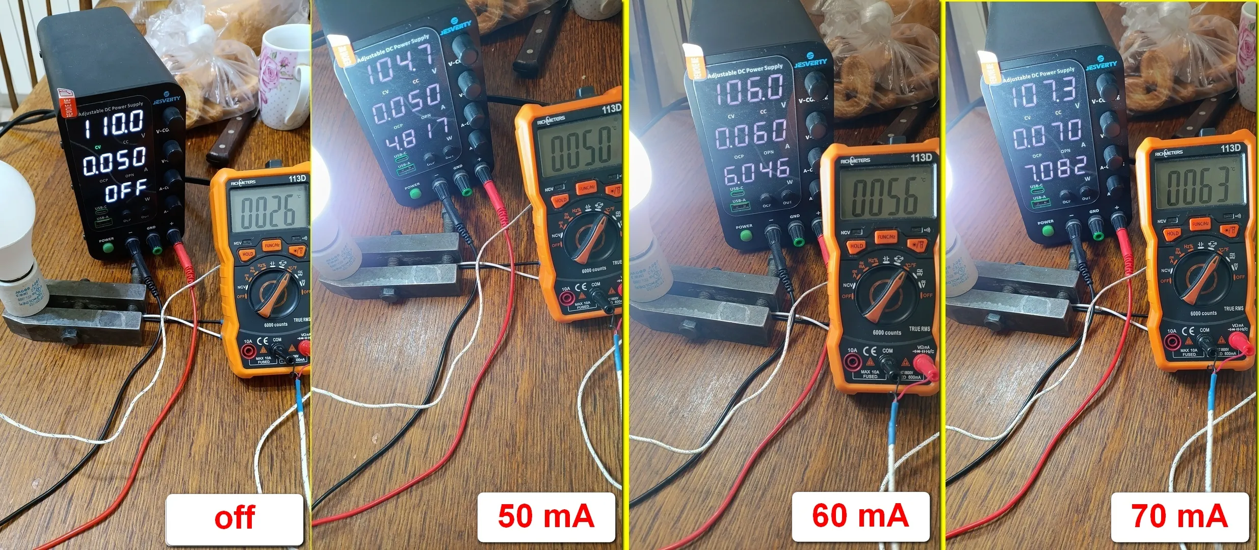 Для этого подключаем лампу от лабораторного блока питания.