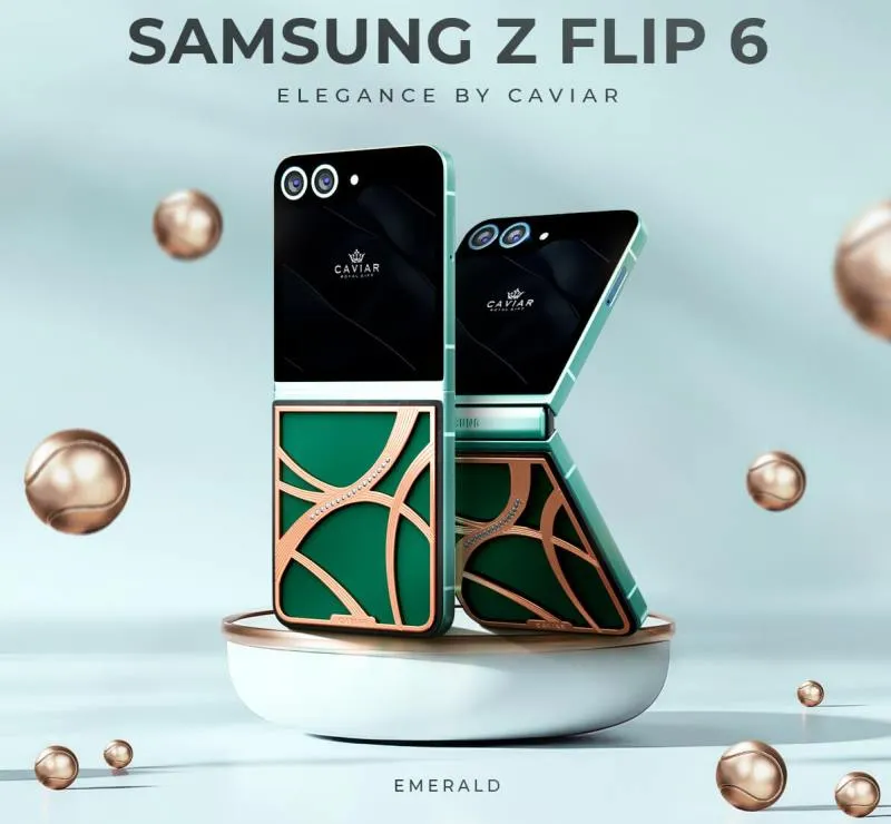 Модель Galaxy Z Flip6 Emerald получила корпус из натуральной кожи Chevre зеленого цвета. Вставки для укрепления корпуса сделаны из ювелирного сплава, покрытого розовым золотом в 24 карата. Дополнением к этому дизайну являются кристаллы Swarovski диаметром 2 мм каждый.
