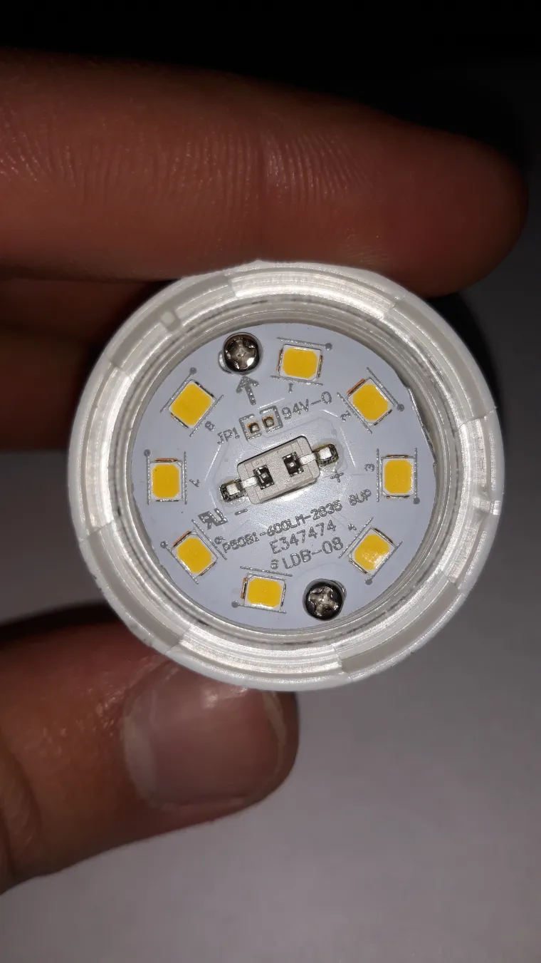 Проверка показала, что все светодиоды исправны, проблема в чем то другом. Лампочка то просто не заработала в один день. У меня появились соображения, что где то пропал контакт.... я проверил контакты, соединяющие драйвер и плату с диодами, с ним все ок. Второе возможное место пропавшего контакта - цоколь, давайте с Вами вместе его снимем!