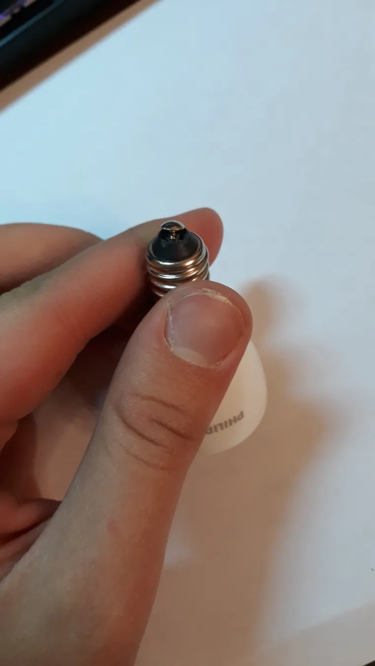 Вот так неаккуратно я снял его, у philips основновательно он был впрессован в корпус, впрочем все равно лампу уже в помойку. Чтобы проверить теорию о плохом контакте, подключим освободившиеся от цоколя два проводника к 220v.
