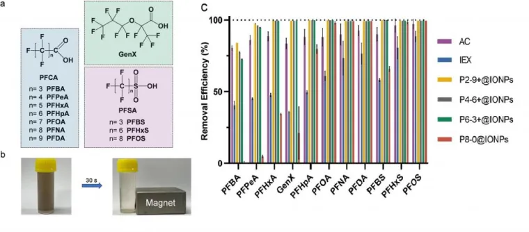 Специальный раствор состоит из магнитного фторсодержащего полимерного сорбента. С одной стороны эти частицы имеют свойства магнита, а с другой – они активно взаимодействуют с ФПАВ за счет химической структуры и присутствия в составе катионных групп и перфторполиэфира. Когда в раствор попадает сорбент, который загрязнен «вечными химикатами», происходит связка с ФПАВ. Остается эти частицы устранить любым магнитным полем всего за пол минуты. Удаляется свыше 95% большинства известных видов ФПАВ, в включая более 99% GenX — одного из наиболее сложно удаляемых веществ.