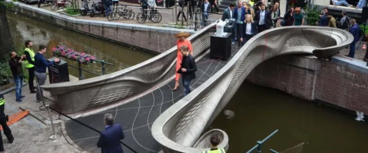 Работа над созданием необычного моста длилась 6 лет и в ней приняли несколько организаций: конструкторское бюро Joris Laarman Lab, инженерная фирма Arup, а также ABB, Air Liquide, ArcelorMittal, Autodesk, AMS Institute и Lenovo. Поскольку на месте печатать его было небезопасно, изготовили на фабрике за полгода в 2018 году. Однако еще требовались дизайнерские моменты. И вот с помощью подъемного крана экспериментальный мост установили сроком на 2 года в районе Красных фонарей Амстердама. Мост размером 12,2х6,3 метра изготовлен из нержавеющей стали при помощи 4 роботов. В мост установлены датчики, которые мониторят уровень нагрузки, вибрации и деформации, собирают данные о погоде, температуре и качестве воздуха, а также количестве пешеходов. Инженеры таким образом смогут регулярно анализировать состояние моста и сделать вывод об эффективности таких сооружений.