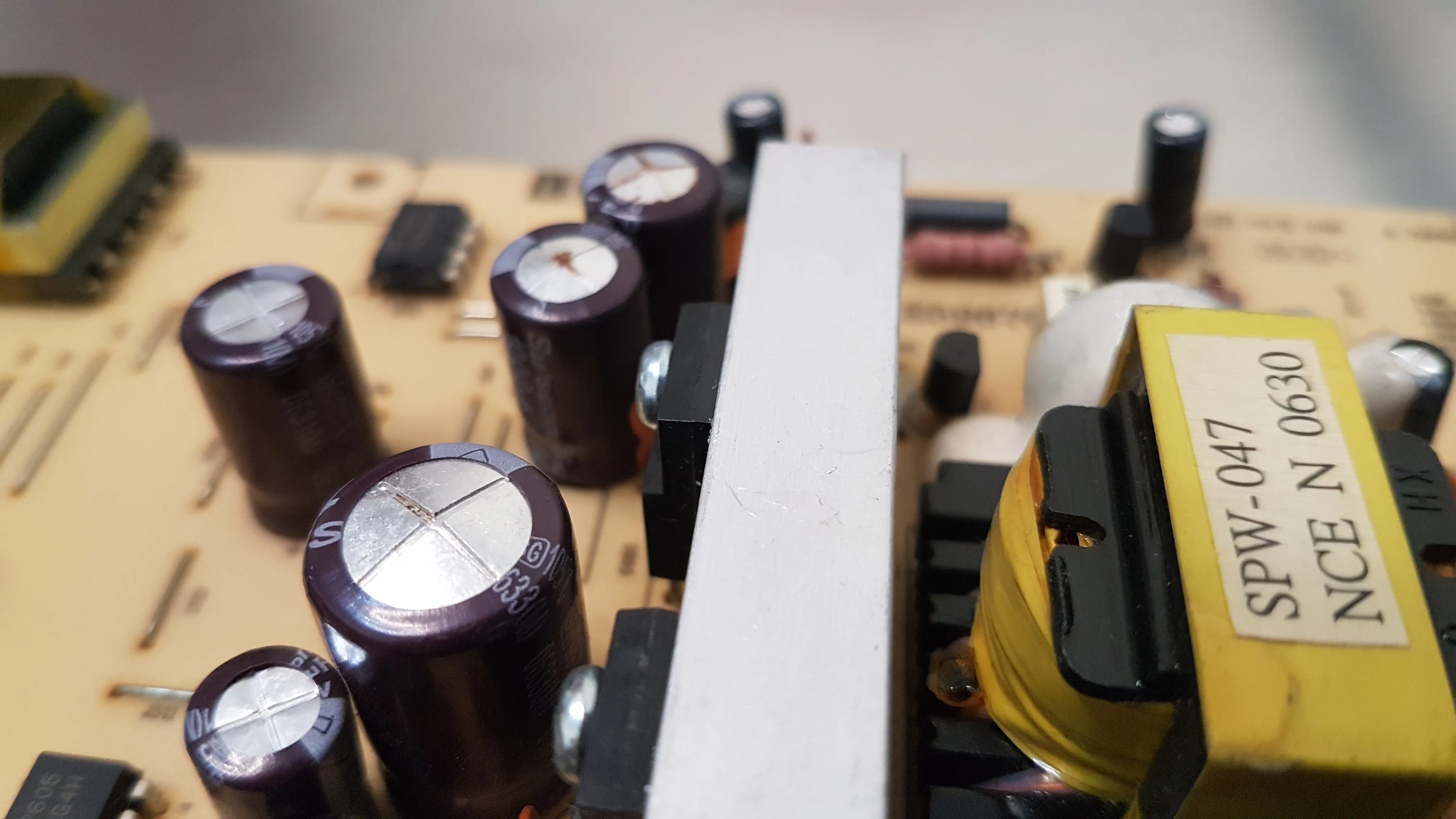 Отсоединив все провода и добравшись до блока питания сразу становится видна причина неисправности - вздутые конденсаторы.