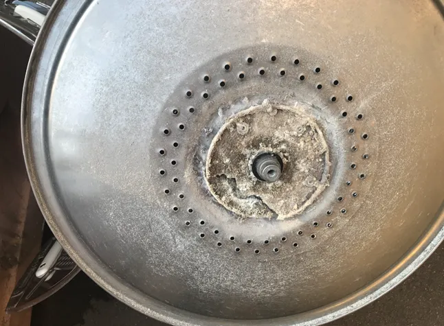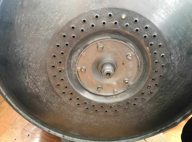 Так в чем же все таки дело? Что неисправно? Что сломалось? А неисправным оказался сам металлический бак. Вернее не бак, а один из фланцев, прикрепленных к баку. Один из двух фланцев вкотором держится ось вращения разъело стиральными порошками и водой и он разрушился. Вот так выглядит эта неисправность: