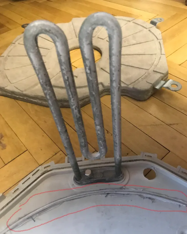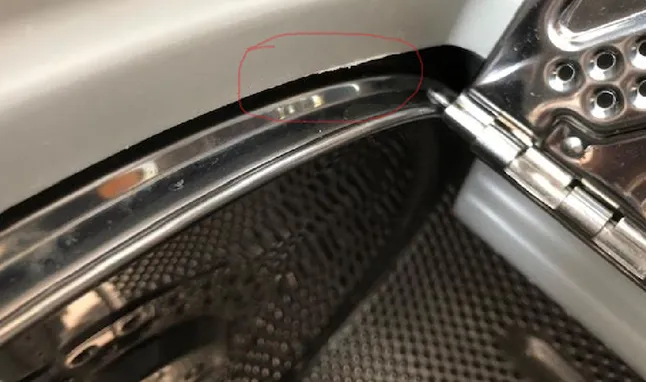 И заметил задир (отметил красным на фотографии) на пластике, который внутри вокруг бака. Как раз серый пластик . Точно такой от которого, похоже, внутри машины остались опилки.