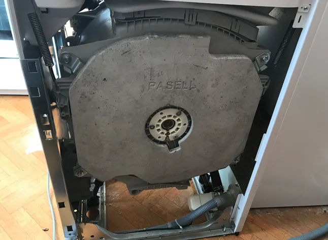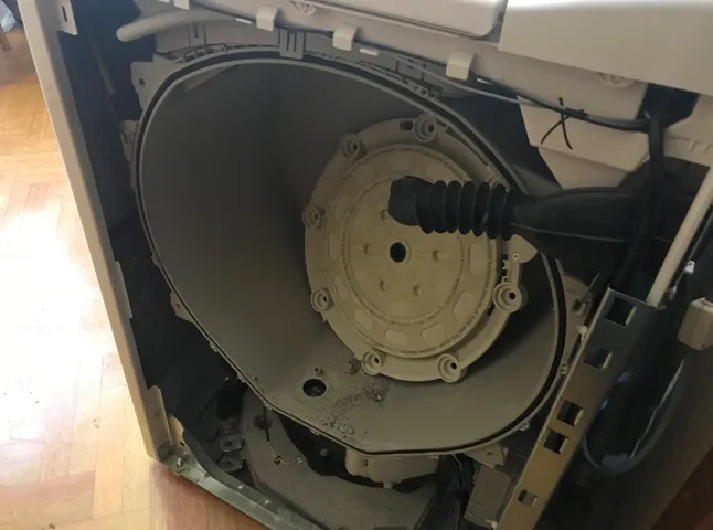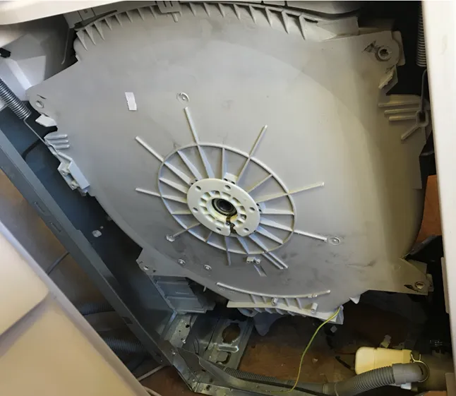 Естественно, разрушенный фланец вместе с осью вращения, вместо того, чтобы быть жестко закрепленным на баке, болтается и бак на больших оборотах бъёт так, что аж снимает стружкус пластика, который вокруг него. На фотографии хорошо видны остатки стружки внутри разобранной машины :