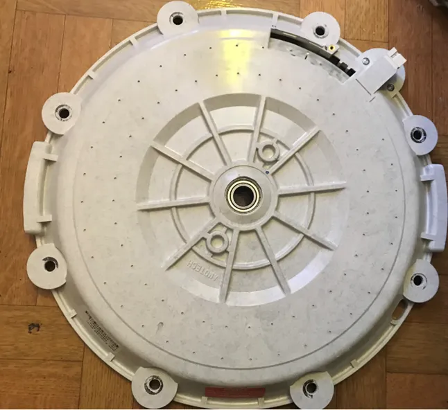 @Схемотехник Похоже, у барабана два одинаковых фланца с "полуосями", один из фланцев рассыпался и соответствующая полуось перестала правильно работать. Но почему от стирального порошка так сильно разъело именно один фланец? Странно, что второй остался цел.