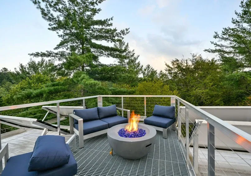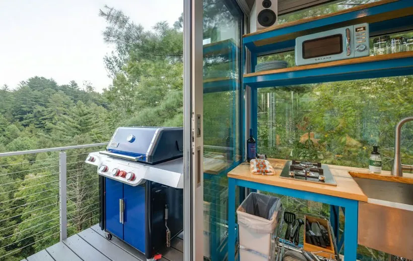 Чтобы попасть на самый верх конструкции, была также построена лестница. В одном из контейнеров можно увидеть обеденный стол, стулья, кухню с мини холодильником, плитку с 2-мя конфорками и микроволновку. К кухне-столовой примыкает спальня с двуспальной кроватью. В комнатах будет много света и естественного освещения за счет установки окон размером от пола до потолка. Также окно есть и в самом потолке. Во втором контейнере просторная ванная комната с душевой кабиной, унитазом со смывом и раковиной. В отдельной зоне отдыха есть балкон, где стоит стол и кресла на двоих, а также барбекю. Винтовая лестница приведет на террасу на крыше, где есть костер и места для сиденья вокруг него.