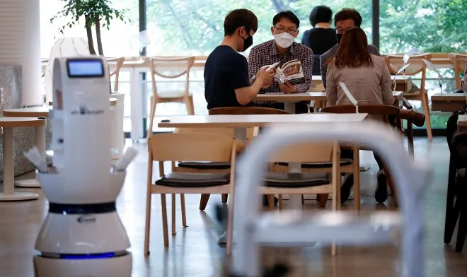 Несмотря на то, что в Южной Корее ситуация с коронавирусом стабилизировалась, владельцы общепитов не спешат к привычному виду обслуживания. Заботясь о безопасности своих посетителей, они решили применить современные технологии. Так в одном кафе в городе Тэджон вместо привычного официанта клиентов обслуживает робот-бариста. Эту разработку представила компания Vision Semicon. В кафе работает всего один человек, который готовит выпечку и загружает роботу нужные для этого ингредиенты. Более того, робот может приготовить до 60 видов кофе и даже подать их посетителю. Зайдя в такое кафе, клиент на терминале выбирает напиток, который затем готовится несколько минут. Машина может сделать сразу 6 порций. Робот выбирает оптимальный путь с помощью функции автопилота к столику, на который он несет заказ. Однако есть во всем этом и существенный минус – потеря тысяч рабочих мест.