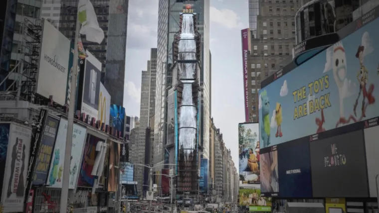 В Нью-Йорке компания Samsung разместила инсталляцию Waterfall-NYC (2021). Это высочайший в мире яркий цифровой водопад, который теперь можно увидеть на Таймс-сквер. Четырехпанельная вывеска высотой 100 м имеет яркость 9000 нит и занимает площадь 1000 м2. Поэтому инсталляцию можно увидеть не только вечером и ночью, но и очень четко днем.