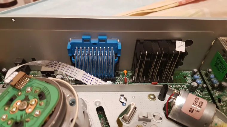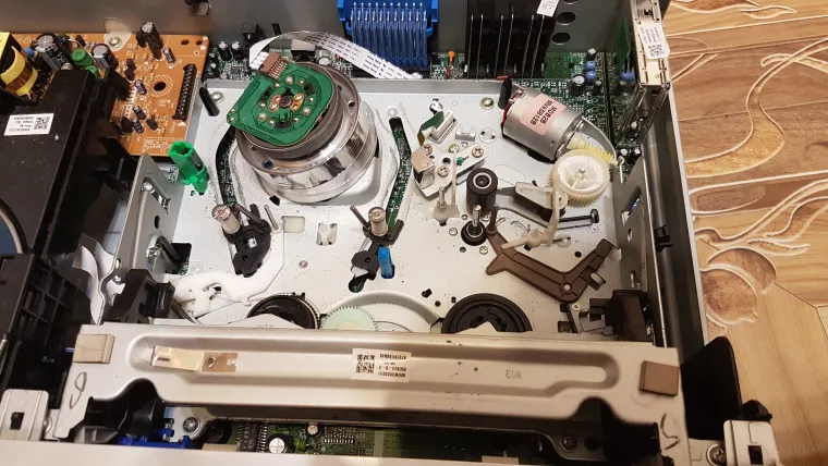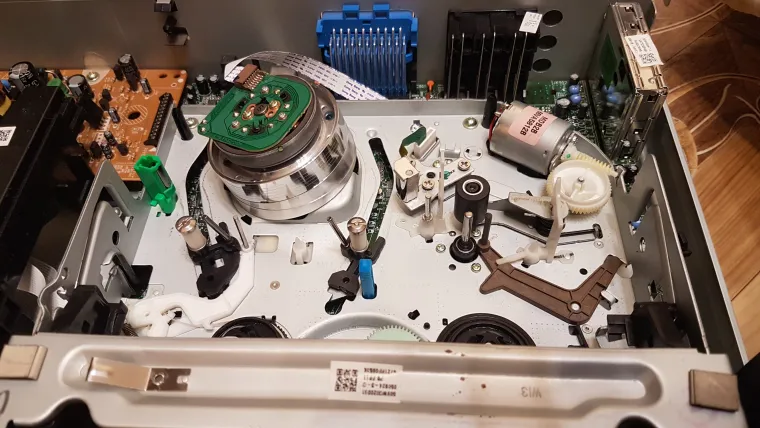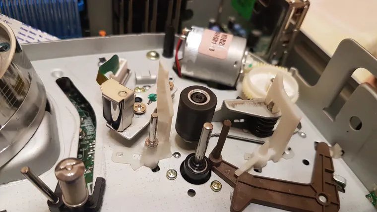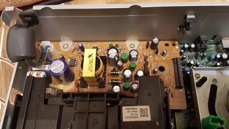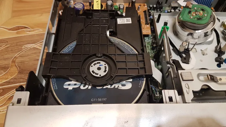 Сразу видно высокое качество изготовления, основная плата из текстолита, а не из гетинакса, причем многослойная. Блок питания чутка простоват, но для такой вещи он в самый раз, и сильно не греется, даже гетинакс не потемнел. Конденсаторы никогда не менялись, хотя этот плеер всегда был включен в розетку. Механизм кассет прост, но надежен. На нем уже 500 кассет было проиграно как минимум. Работал как часы до сегодня..... DVD привод полностью рабочий, на нем аналогично пересмотрено множество DVD. Ничего не поломалось получается? Нет, он уже ломался. Я его весь чистил и менял пасик на кассетной части, а также перебирал и смазывал все механизмы. Ну вот видимо после 500 кассет пришло время повторить процедуру? Давайте поближе рассмотрим основные его компоненты.