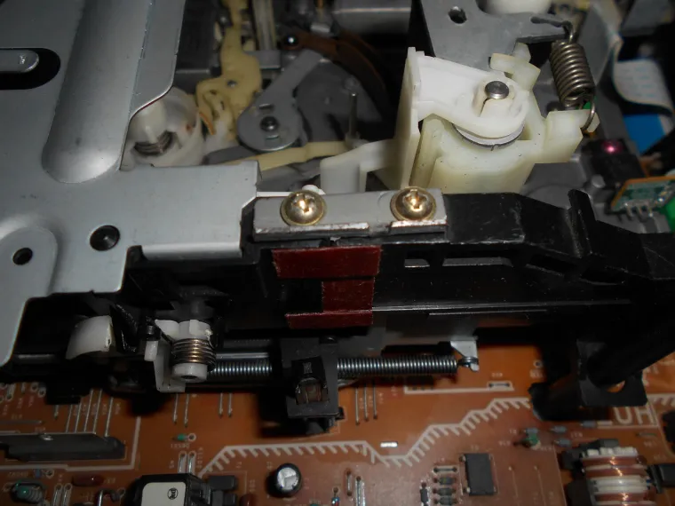 Под ним находится огромная "главная плата", "материнская плата" или как её еще там назвать....короче основная плата, которая за все отвечает. Весьма неправильное решение, ведь на неё могут попасть обломки видеокассет, например пружинки или крепления какие нибудь. Смазка с механизма лентопротяжки тоже может туда попасть. Ну ладно, перейдем ближе к делу.