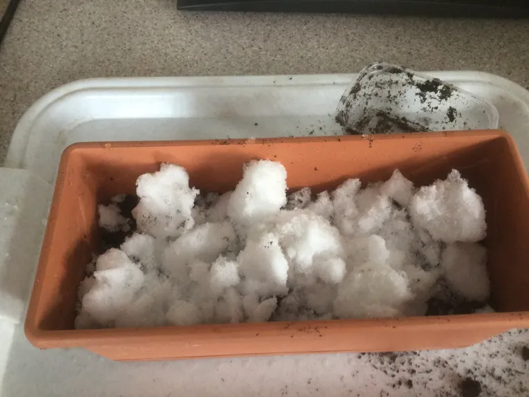Землю в ящик кладу с добавлением снега. Земля равномерно пропитывается снеговой водой.