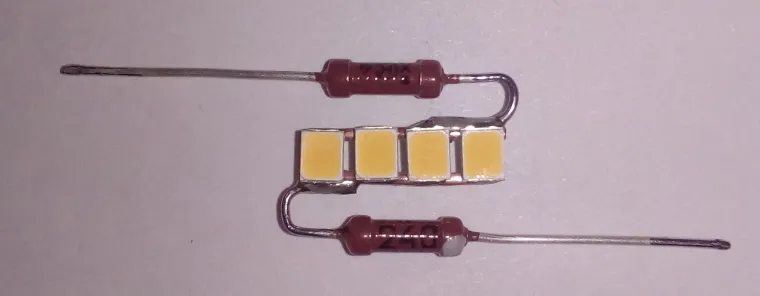 Вариант 5. Четыре светодиода 18V/60mA/3000К (по два встречно параллельно) от светодиодной лампы, и два резистора последовательно по 240 кОм. В процессе эксплуатации выявлено достаточное свечение светодиодов и отсутствие нагрева. Скорее всего, данный вариант является заключительным.
