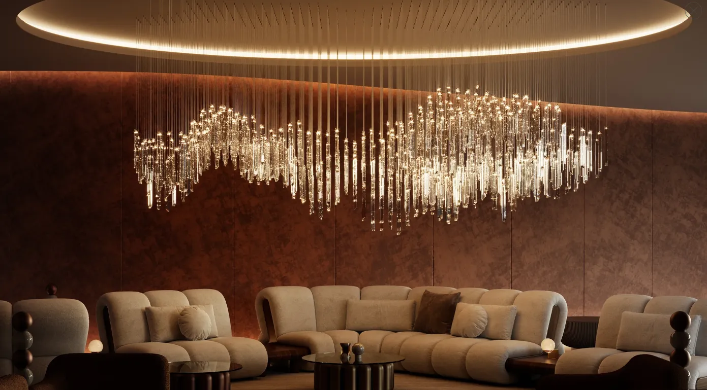 Преимущество конструкции в том, что можно собирать индивидуальные конфигурации. Это могут быть сгруппированные волны, которые укрывают холл, а также изящные вертикальные каскады.